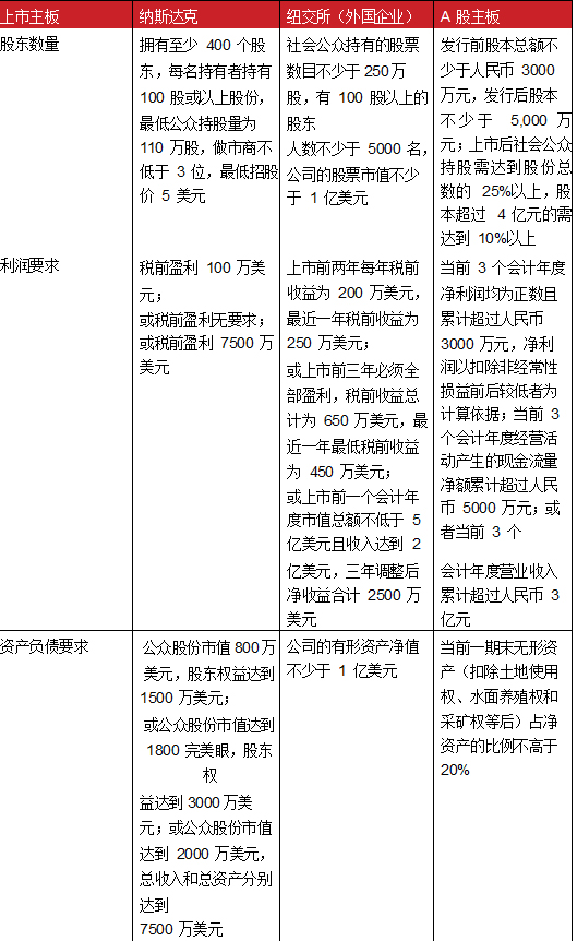 从上表中可以看出,在上市条件设置上中国 A 股市场比美国纽交所、纳斯达克的标准更加严格,在盈利能力、资产负债等财务指标上对拟上市企业提出了更高的要求。处于扩张期、销售收入增加迅速但尚未盈利的企业,选择纳斯达克上市不失为合适的选择。例如京东于 2014 年 5 月份上市美国纳斯达克时,在招股书内公布的第一季度净亏损为 37.95 亿元,这一财务数据显然不能满足国内主板上市的财务指标要求。类似于京东,TMT、消费等轻资产行业在目前国家脱虚向实的大政策背景环境下也难以登陆国内 A 股市场,他们也将美股市场当做下一步筹资的目的地,如 2017 年 10 月和 11 月上市的趣店和搜狗均选择了美股上市,一方面避开了国内审批制的漫长等待,另一方面能够在扩张期内加快筹资步伐。