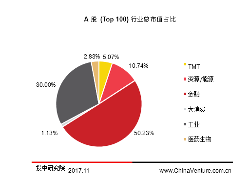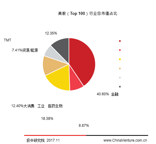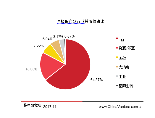 当前,国内 A 股市场依旧主要由金融行业为导向,金融类企业市值占比达50.23%。而在美股市场上,金融企业市值占比仅为 18.38%,占据主导地位的主要是 TMT 和医药生物类以技术科技为导向的企业,这两个领域企业的市值占比分别为 40.60%和 12.35%,合计占比近 53%。由此可以看出,国外资本市场主要由技术科技驱动型企业为主导,而国内股市当前仍以传统金融类企业为主导。与中美股市相比,中概股市场在行业占比上具有更加明显的技术驱动属性,TMT 类企业市值占比达 64.37%,远远超过金融类企业市值 7.22%的占比。而伴随着中国互联网金融的迅速发展,国内的金融企业势必将更加深入的参与中概股上市浪潮中,截至 2017 年 11 月,已有信而富、趣店、和信贷、拍拍贷和融 360 等 5 家互联网金融企业进入美股市场,未来金融与科技的融合势必将成为中概股的另一种景象。