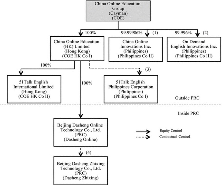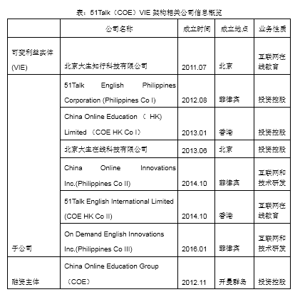拟上市的公司中国在线教育集团(COE)(融资主体)于 2012 年 11 月在开曼群岛注册,其 100%持股控制在中国香港注册的中国在线教育(香港)有限公司(COE HK Co I),99.99%控股在菲律宾注册的 China Online Innovations Inc.(Philippines Co II) 公 司 以 及 On Demand English Innovations Inc.(Philippines Co III)公司;中国在线教育(香港)有限公司(COE HK Co I)通过 100%控股在北京注册的全资子公司北京大生在线科技有限公司进而间接通过其签订的相关一系列控制协议,来控制国内运营的实体企业(北京大生知行科技有限公司),从而实现互联网在线教育业务在中国国内的运营。