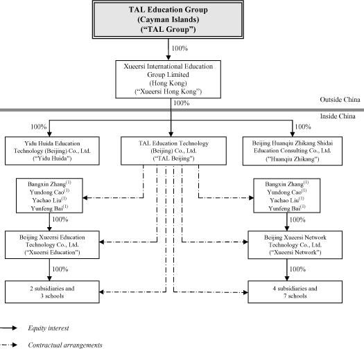 由于中国法律限制具有外资背景的企业在中国运营教育类事业,好未来(学而思)通过在 TAL 北京、北京学而思教育科技有限公司、学而思网络科技有限公司和他们各自的股东、子公司及学校之间一系列的控制协议安排,来实现在中国境内教育辅导业务的运营。好未来(学而思)通过上述的 VIE 架构搭建来有效规避相关监管规定可能涉及到的风险,以顺利实现公司的上市目的。