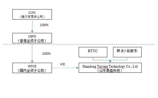 泰盈科技于 2014 年设计完成了境外股权 VIE 架构,如上图所示,上市主体为 China Customer Relations Centers,Inc.(CCRC)公司注册地点是英属维尔京群岛。2014 年 9 月 3 日,山东泰盈科技及其唯一股东北京泰盈与外商独资公司订立委托管理协议,独家购股协议,投票代理权协议及质押权协议质押协议(统称“控制权协议”)获得在 CCRC 的所有权利益。 通过组建 CCRC 作为控股公司,北京泰盈的股东现在拥有了 CCRC 96%的普通股,其余股份属于另外 5 名投资者。CCRC 通过其外商独资企业的 100%股权间接控制山东泰盈。通过这一系列协议安排,BTTC 可以控制经营公司的日常经营和财务事务,任命高级管理人员,批准所有需要股东批准的事项。