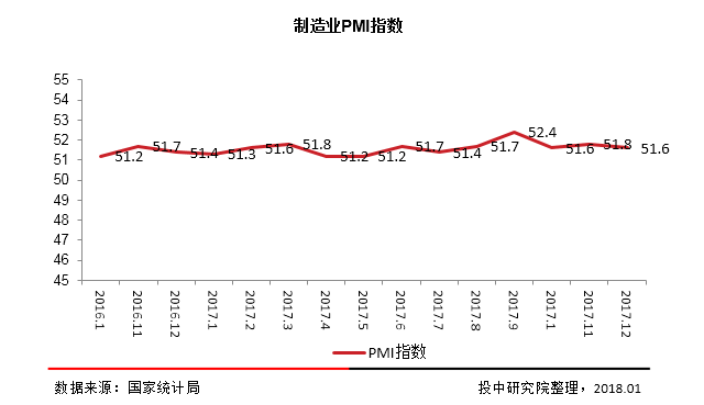 从另一个角度来看,国内经济持续稳定,最新发布的2017年12月份制造业采购经理指数(PMI)为51.6%,连续 15个月站在50%荣枯线之上。从PMI看,2017年中国经济运行中的积极因素不断累积、作用凸显,企稳态势巩固,向好发展态势进一步明显。主要呈现出经济发展的稳定性增强、经济发展效益提高、企业经营模式创新加快等特点。