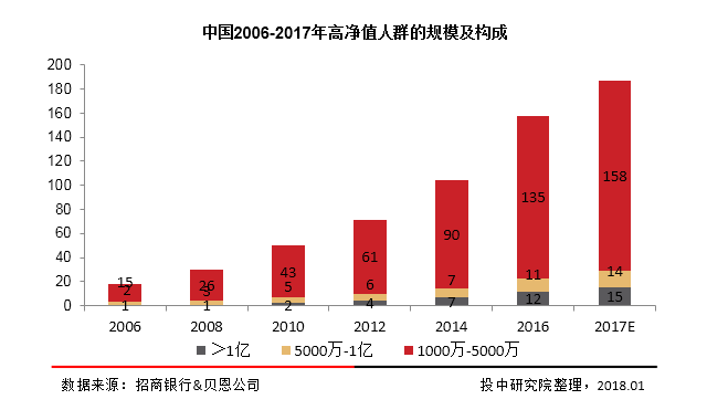 伴随十年经济发展,中国私人财富市场规模十年增长五倍,持续释放可观的增长潜力和巨大的市场价值。2016年,在国内经济L型运行的背景下,中国私人财富市场继续保持高速增长,高净值人群数量达到158万人,个人持有的可投资资产总体规模达到165万亿元。预计2017年中国私人财富市场将继续稳步增长,高净值人群将达到187万人左右,个人可投资资产总体规模将达到188万亿元,同比增长14%。