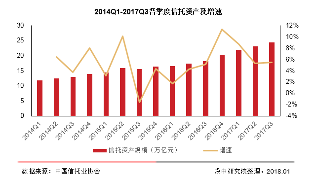 2017年以来,信托公司财富管理业务发展迅速,财富管理能力更加完善。根据信托业协会统计数据显示,信托行业管理的资产规模保持稳健增长,截至 2017年3季度,信托资产余额达24.41万亿元,比2季度末增加了1.27万亿元。信托资产规模同比增速为34.33%,环比增长了5.47%。