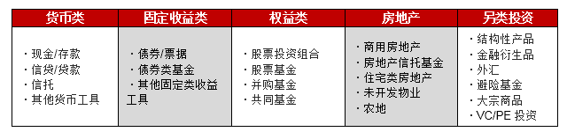 全球财富管理机构的产品主要分为五大类,第一,货币类:主要包括现金、信贷、信托等;第二,固定收益类:主要包括债券、债券类基金等;第三,权益类:主要包括股票投资组合、股票基金、并购基金、共同基金等;第四,房地产:主要包括商用房地产、房地产信托基金、住宅类房地产、未开发物业、农地等。第五,另类投资:主要包括结构性产品、金融衍生品、外汇、避险基金、大宗商品、VC/PE投资等。