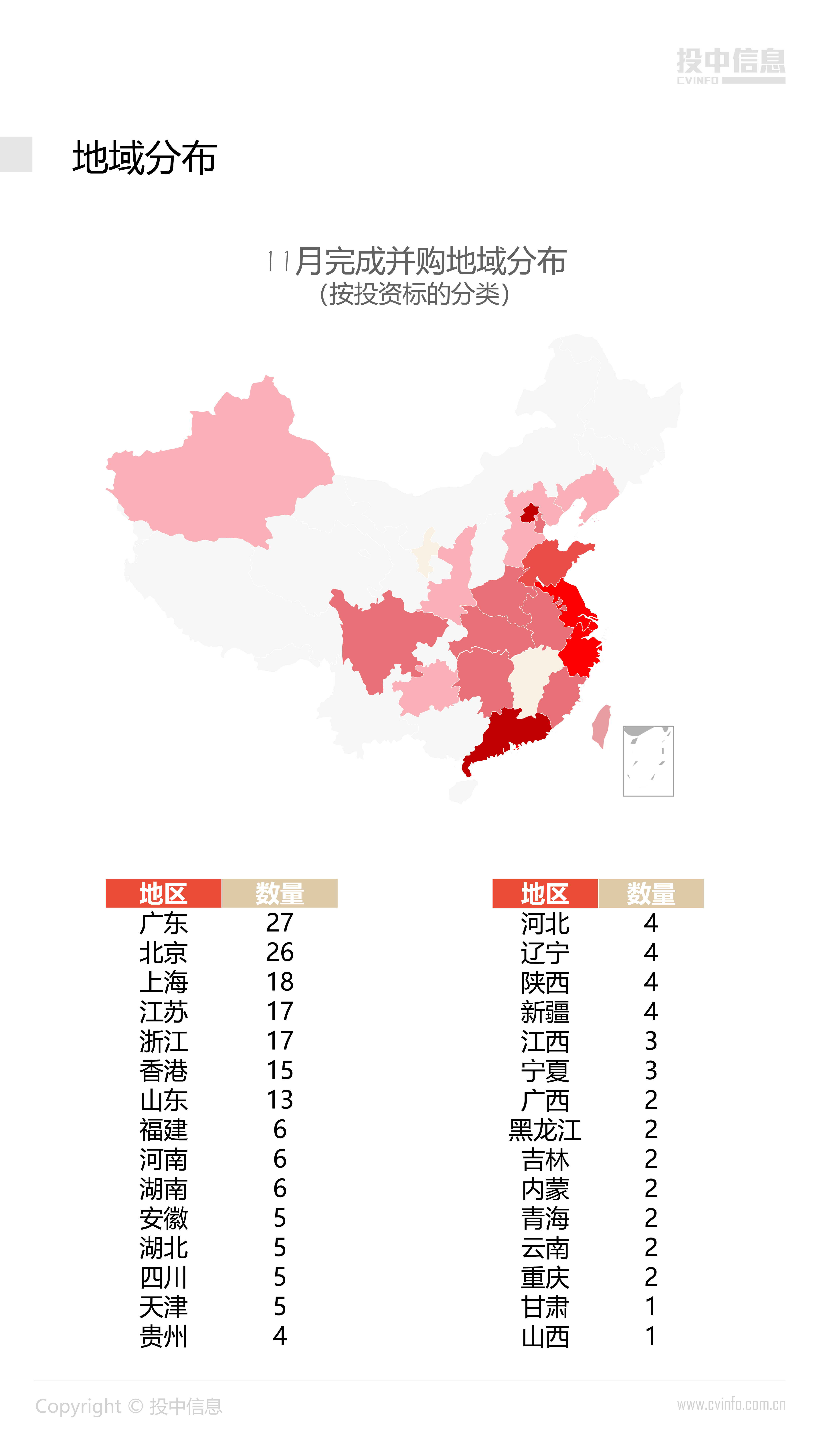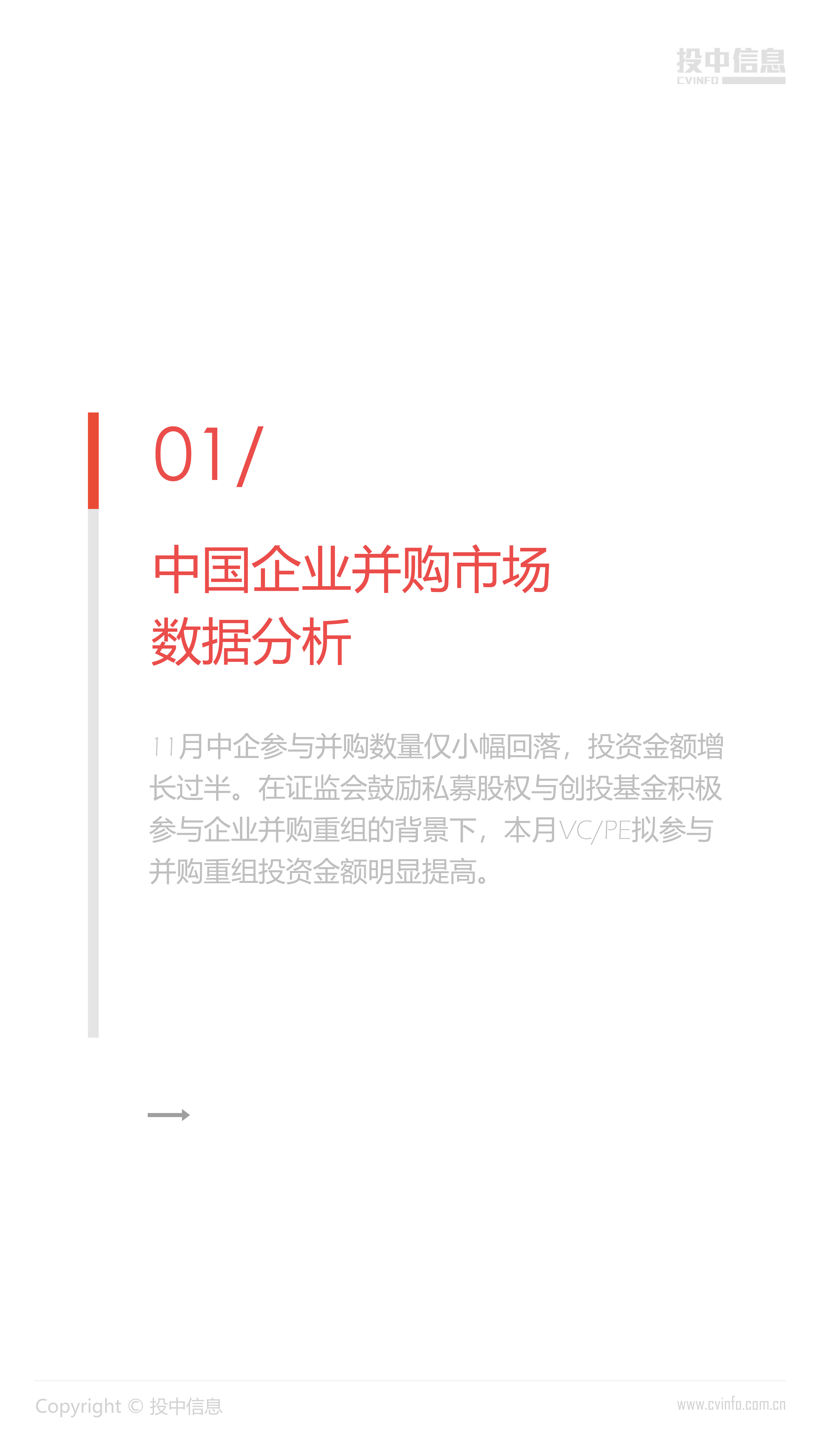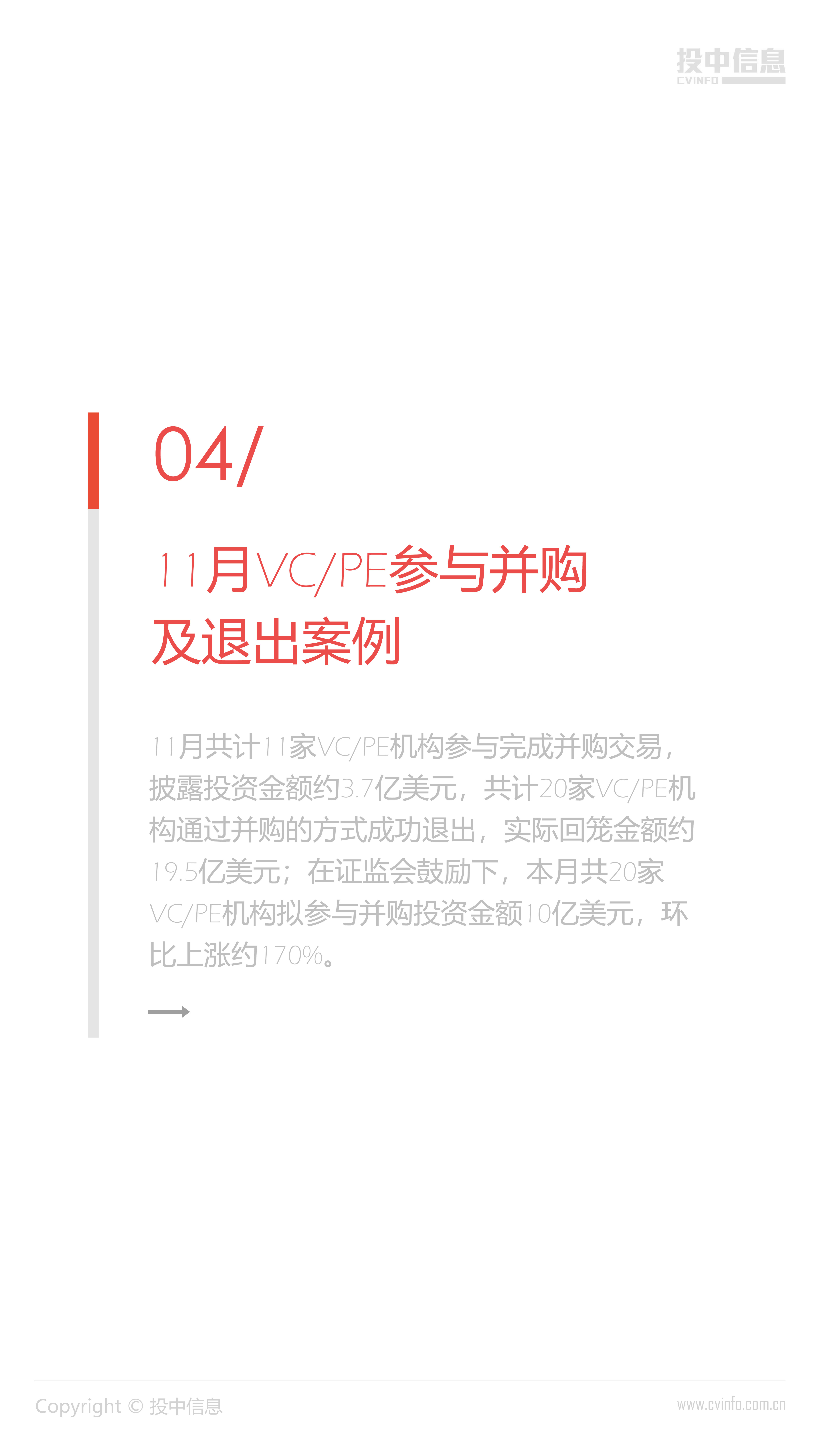 11月中企参与并购数量仅小幅回落,投资金额增长过半。在证监会鼓励私募股权与创投基金积极参与企业并购重组的背景下,本月VC/PE拟参与并购重组投资金额明显提高。