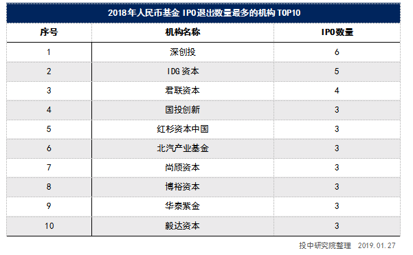 2018年人民币基金IPO退出最多的机构是深创投,但仅有6家,较2017年深创投19家上市有大幅下滑;IDG资本5家、君联资本4家;国投创新、红杉资本中国、北汽产业基金、尚颀资本、博裕资本、华泰紫金和毅达资本分别为3家。