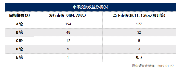 2018年7月9日,小米集团(01810.HK)港交所主板上市,发售价格17.00港元/股,共计募集金额总额243.85亿港元。作为港股“同股不同权”创新试点的首家上市公司,小米跃升全球科技股前三大IPO,仅次于阿里巴巴和Facebook。作为早期投资者的晨兴资本的一笔500万美元投资,按照雷军所说,回报倍数达到866倍。按IPO市值484.73亿美元计算,晨兴资本当时500万美元的投资,占已发行股份的8.93%。即使小米股价已经较发行价下滑40%,按当下股价10港元/股计算,这笔投资现在的市场价值也超过30亿美元,回报倍数达600倍。早期投资小米为晨兴高回报提供了足够厚的安全垫。晨兴资本也因此成为2018年VC/PE机构单笔投资回报倍数和总额最高的机构。