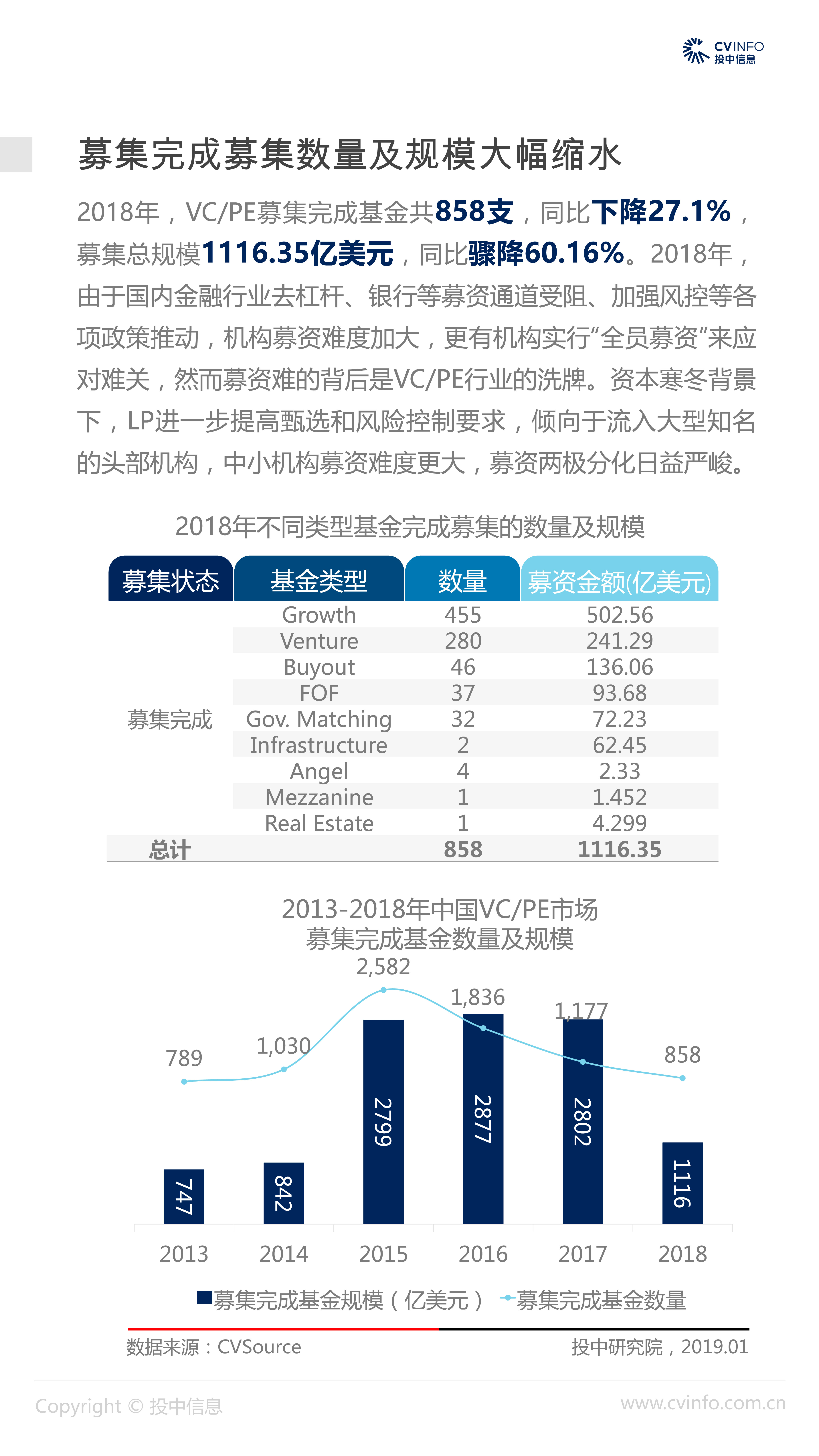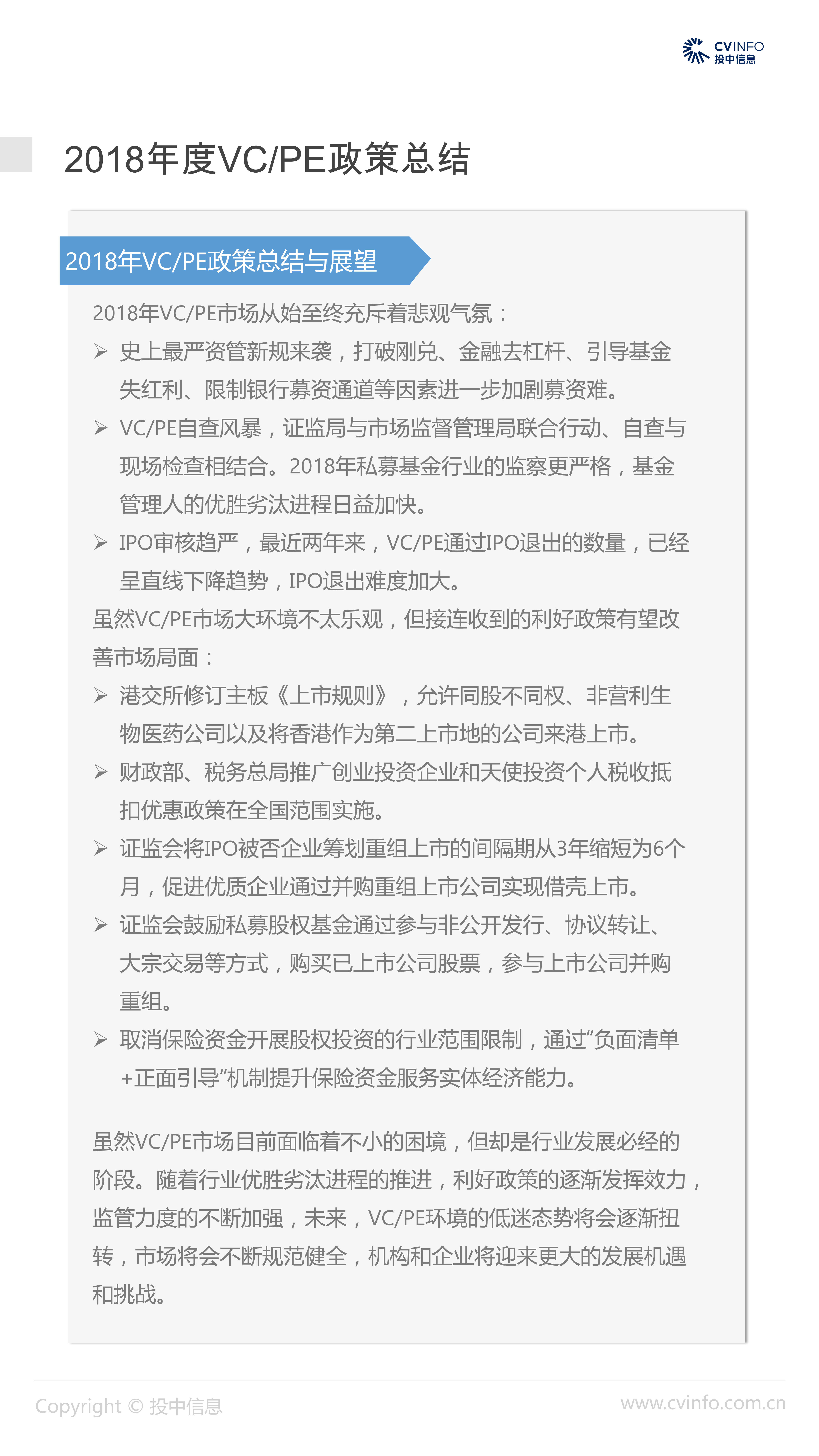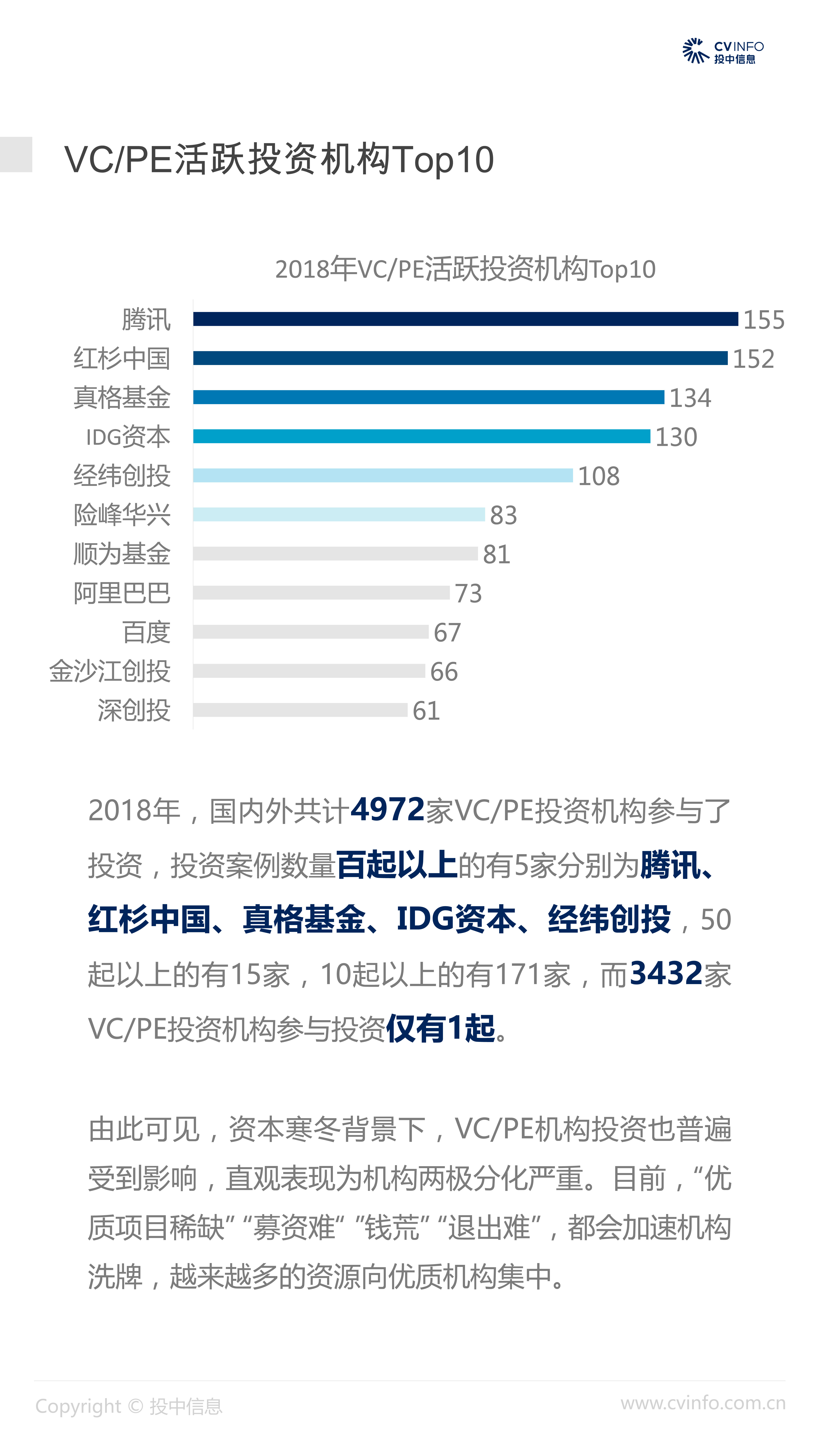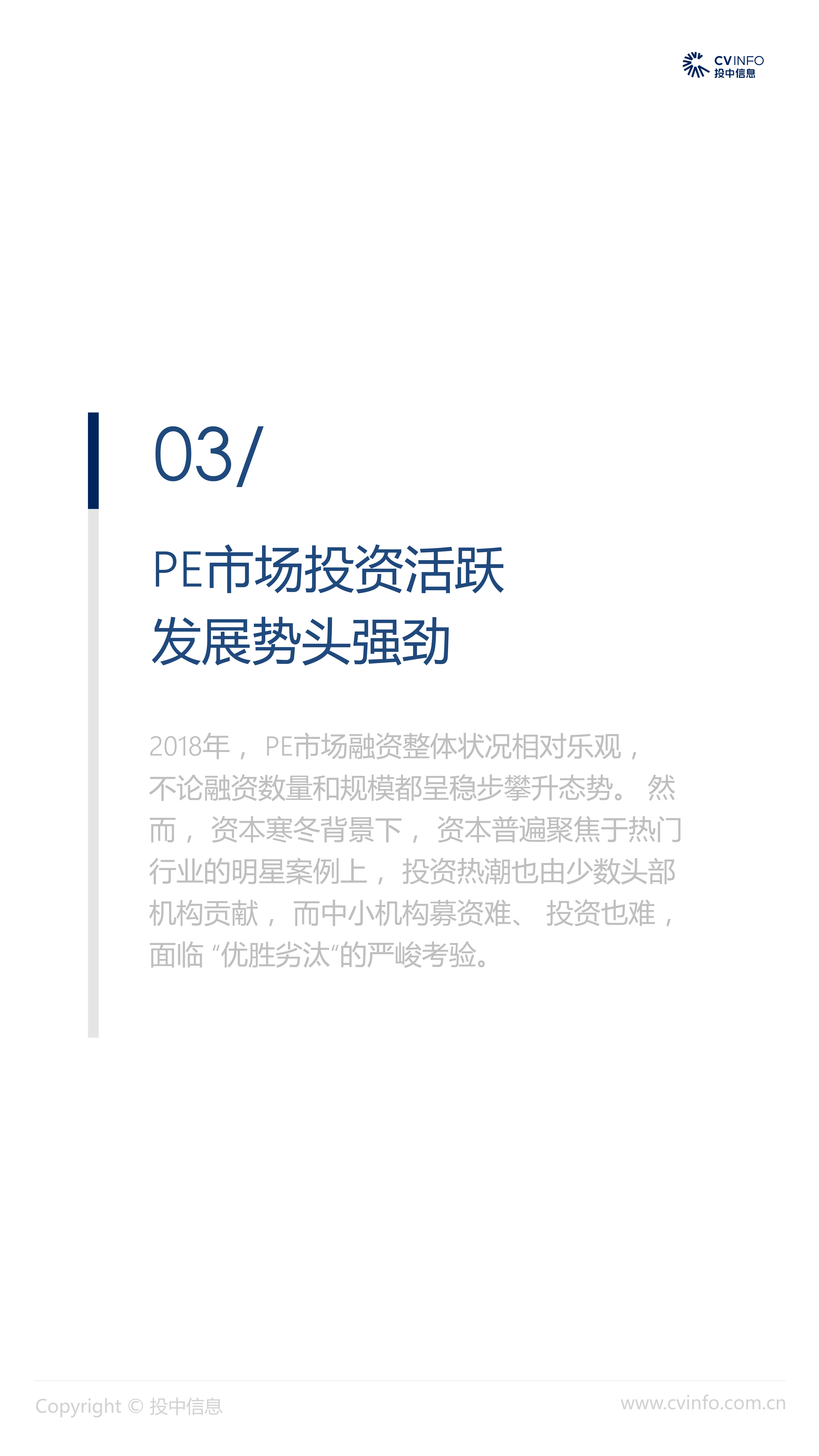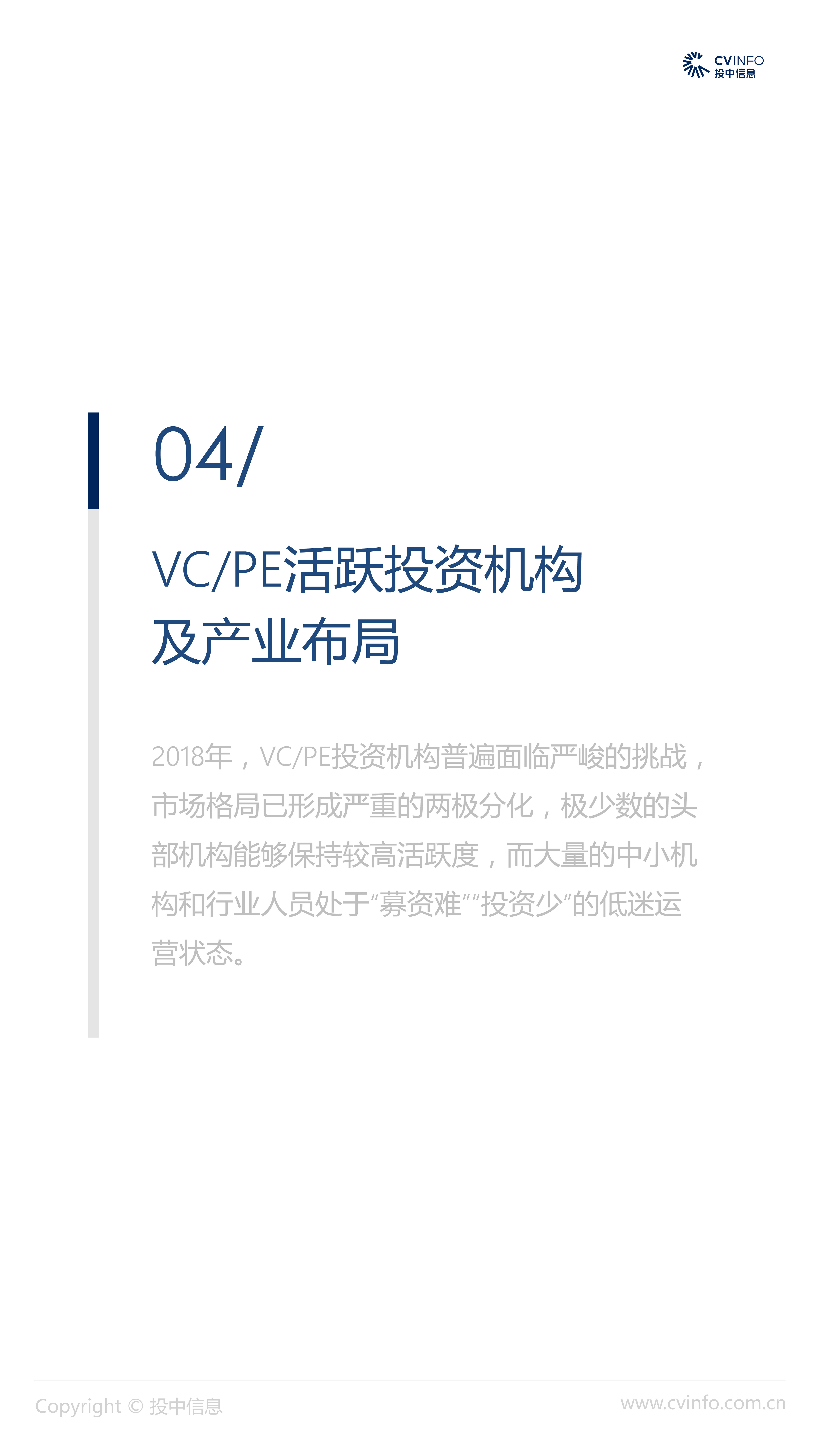 募资:2018年VC/PE市场全面进入洗牌期,新成立的基金多数仍滞留在募资阶段,募资周期变长。2018年VC/PE机构募集新基金的需求依旧强劲,然而在募资需求不断增长的同时,资金争夺战也在日益激烈,募资难问题全面爆发。 投资:2018年创投市场逆势而上,仍然保持着较高活力,整体投融资表现稳中有升。PE市场融资整体状况相对乐观,不论融资数量和规模都呈稳步攀升态势。 机构:2018年,VC/PE投资机构普遍面临严峻的挑战,市场格局已形成严重的两极分化,极少数的头部机构能够保持较高活跃度,而大量的中小机构和行业人员处于“募资难”“投资少”的低迷运营状态。
