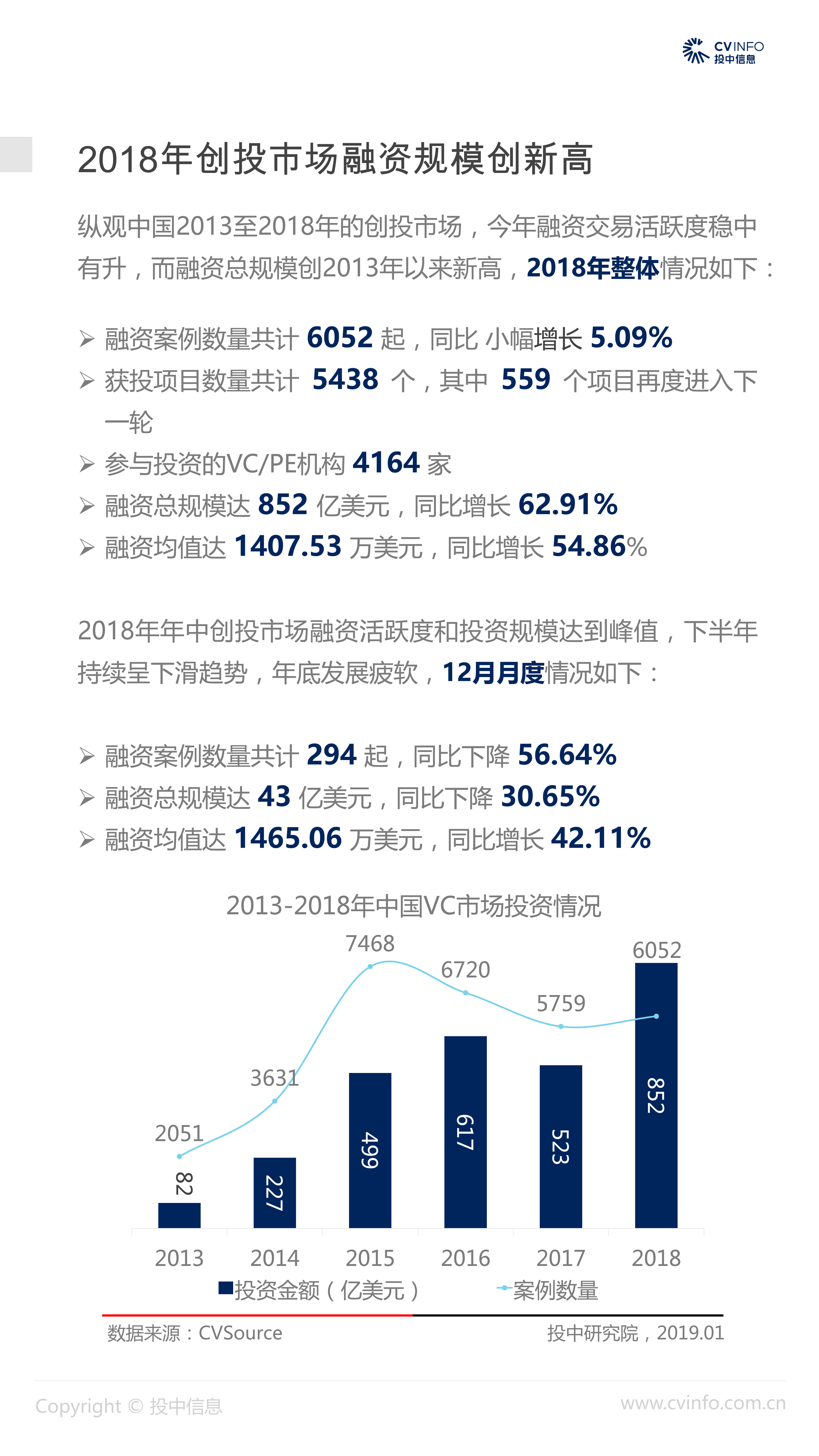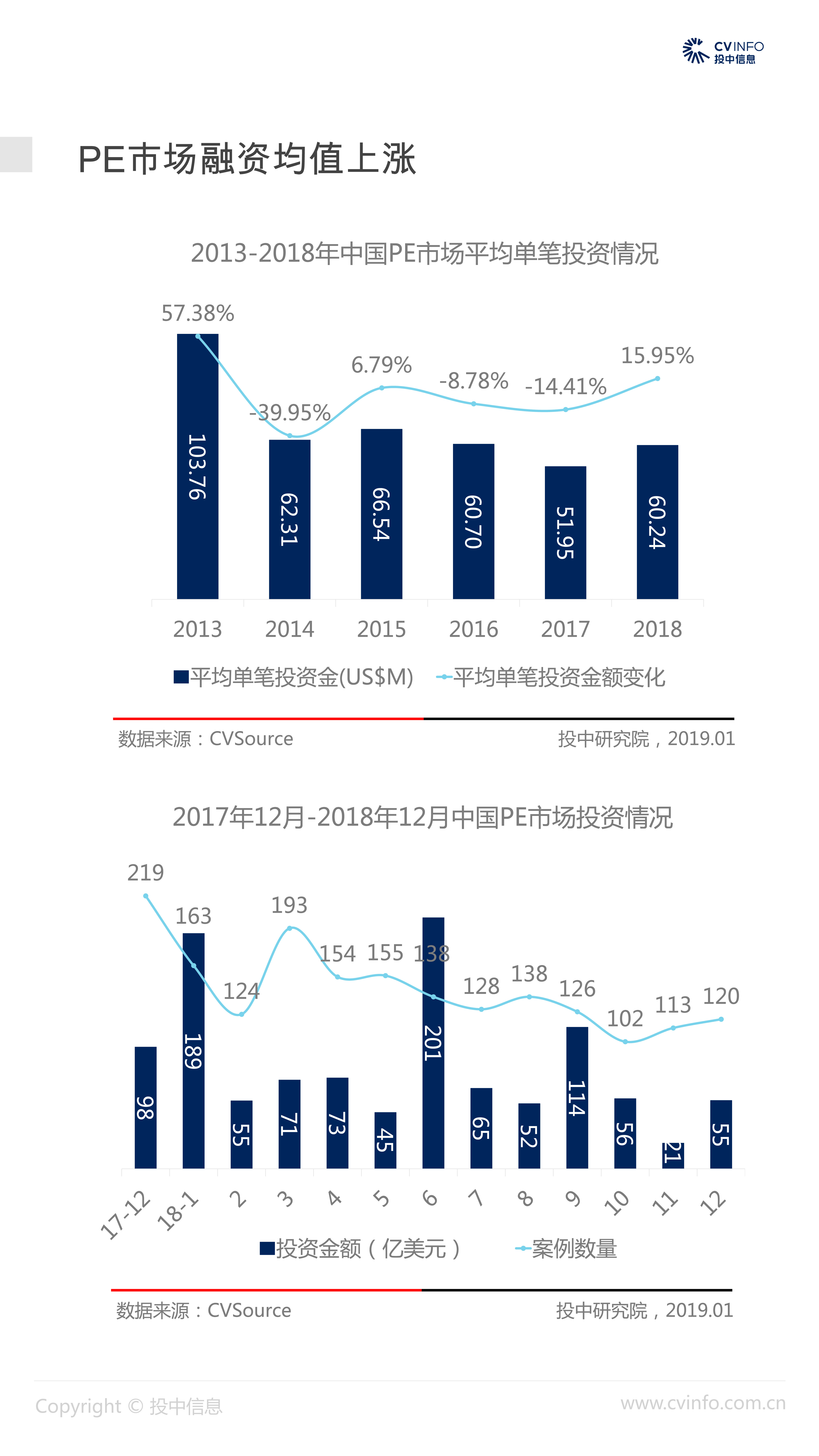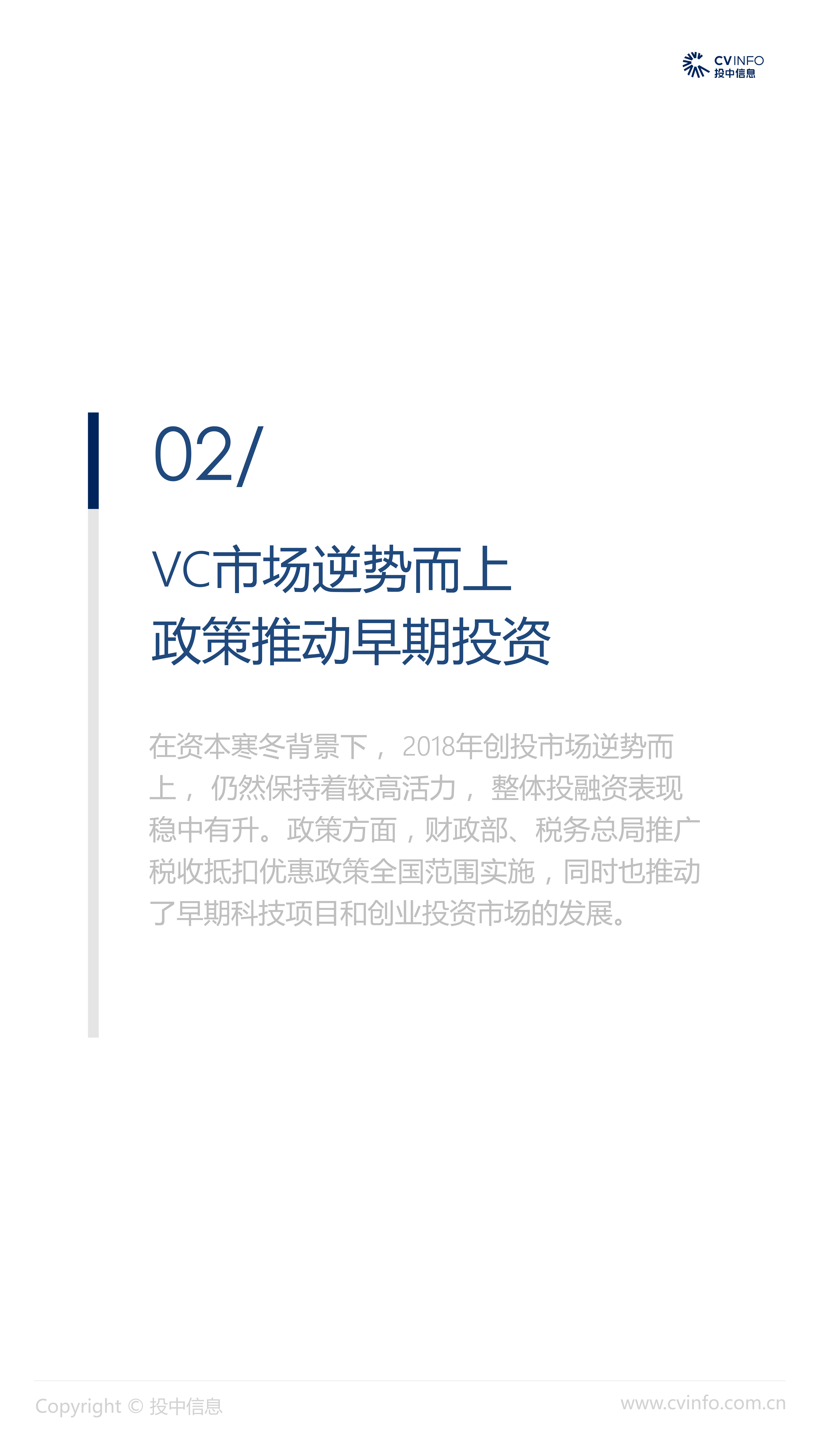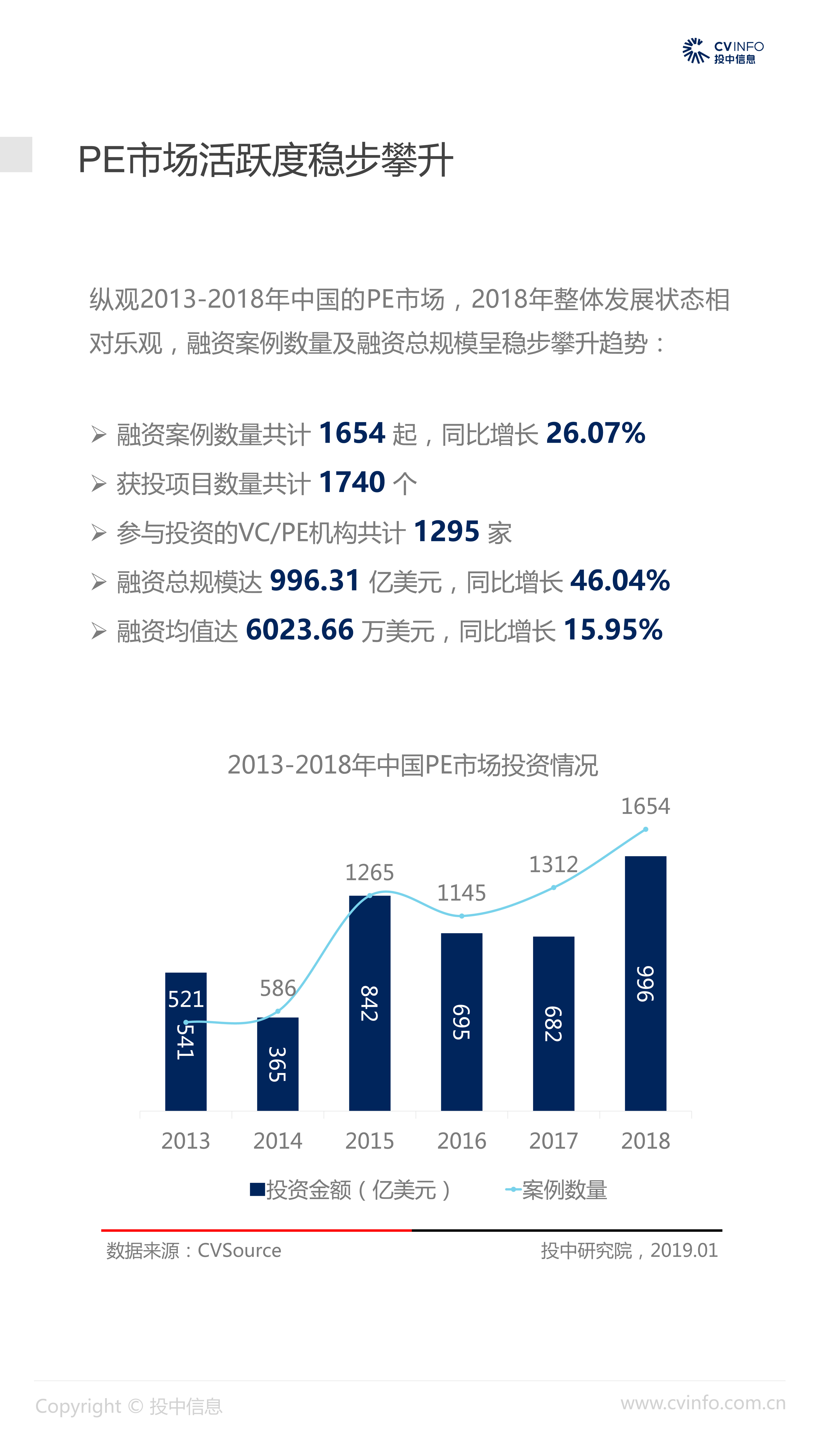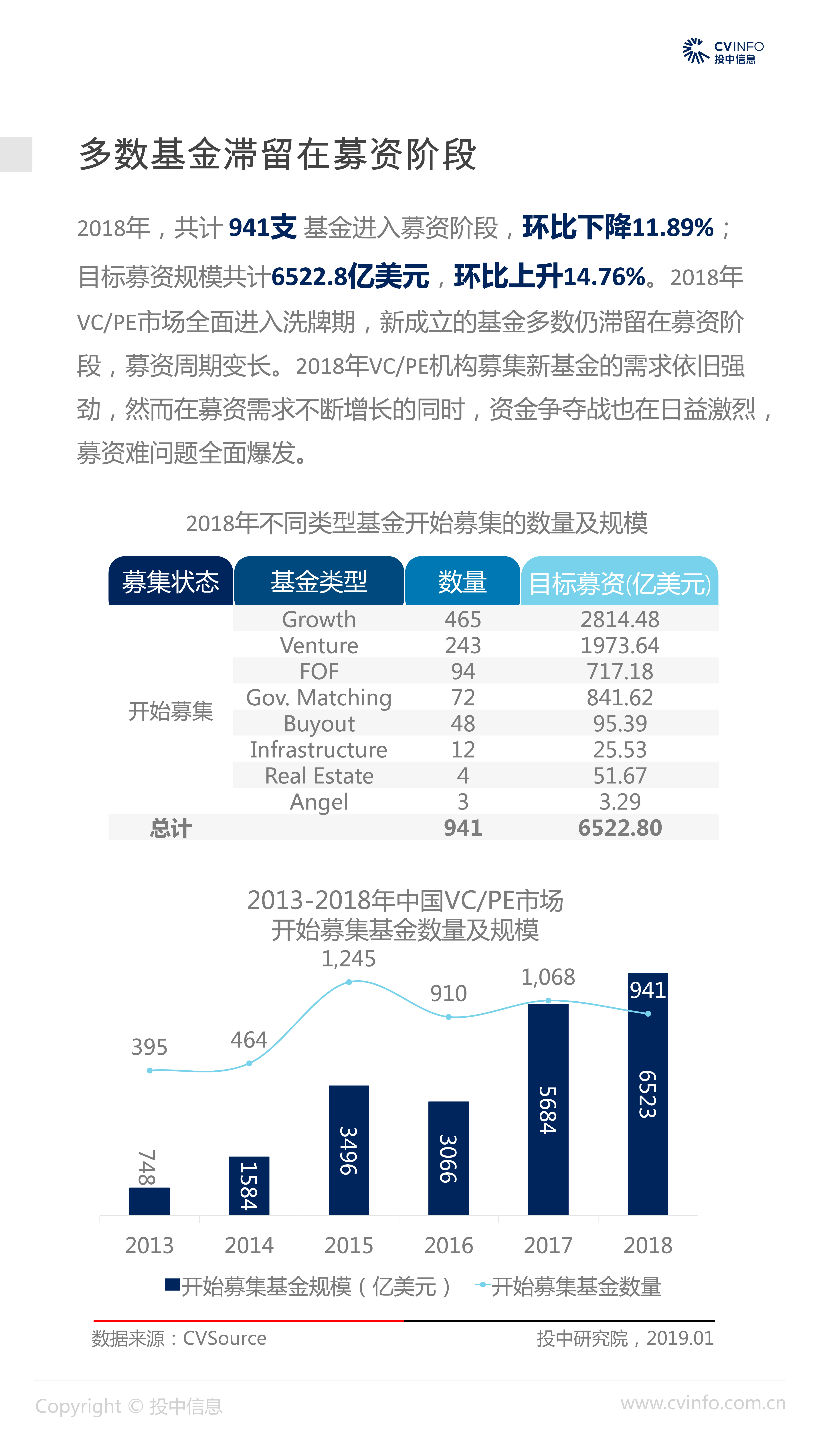 募资:2018年VC/PE市场全面进入洗牌期,新成立的基金多数仍滞留在募资阶段,募资周期变长。2018年VC/PE机构募集新基金的需求依旧强劲,然而在募资需求不断增长的同时,资金争夺战也在日益激烈,募资难问题全面爆发。 投资:2018年创投市场逆势而上,仍然保持着较高活力,整体投融资表现稳中有升。PE市场融资整体状况相对乐观,不论融资数量和规模都呈稳步攀升态势。 机构:2018年,VC/PE投资机构普遍面临严峻的挑战,市场格局已形成严重的两极分化,极少数的头部机构能够保持较高活跃度,而大量的中小机构和行业人员处于“募资难”“投资少”的低迷运营状态。