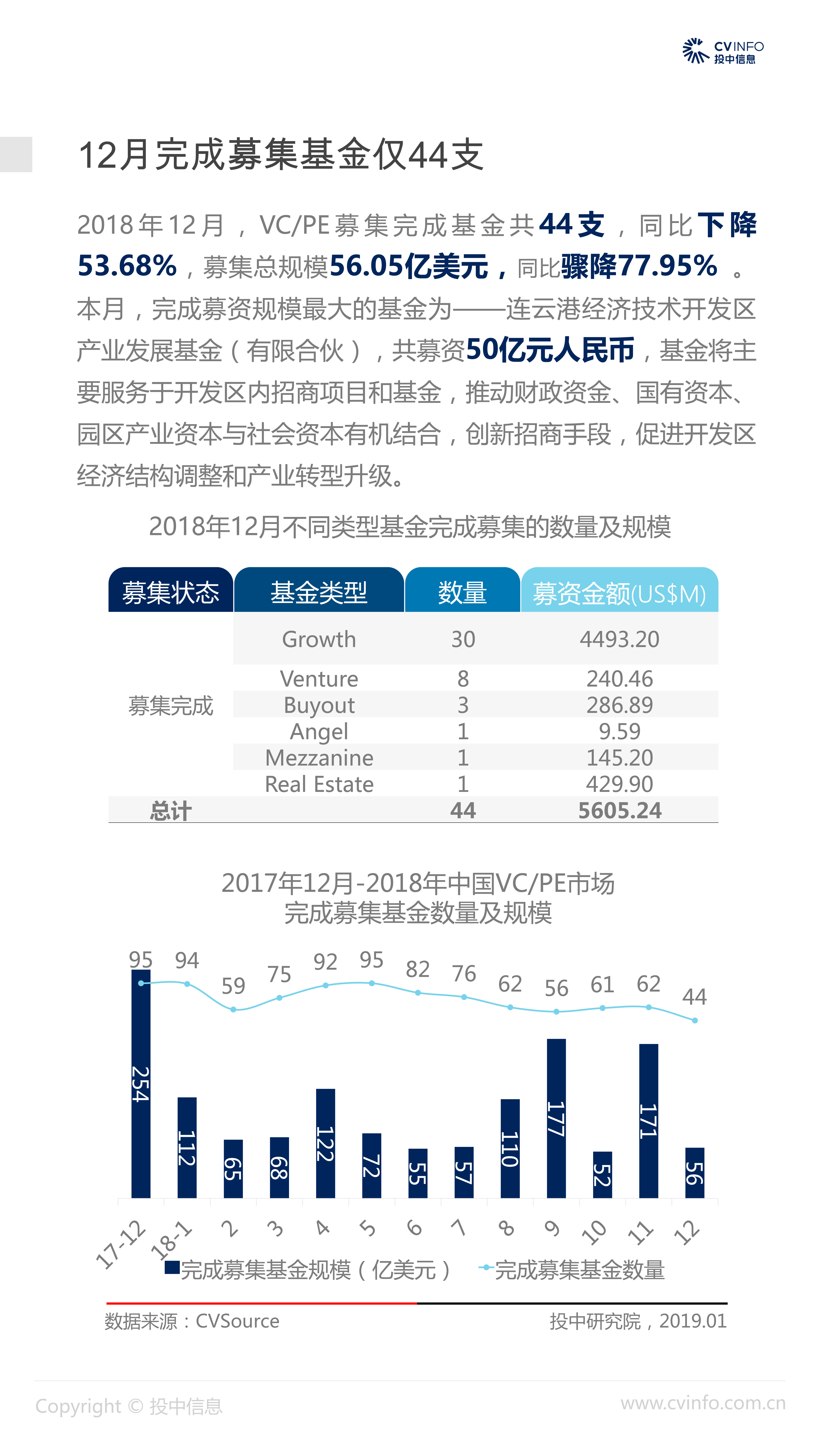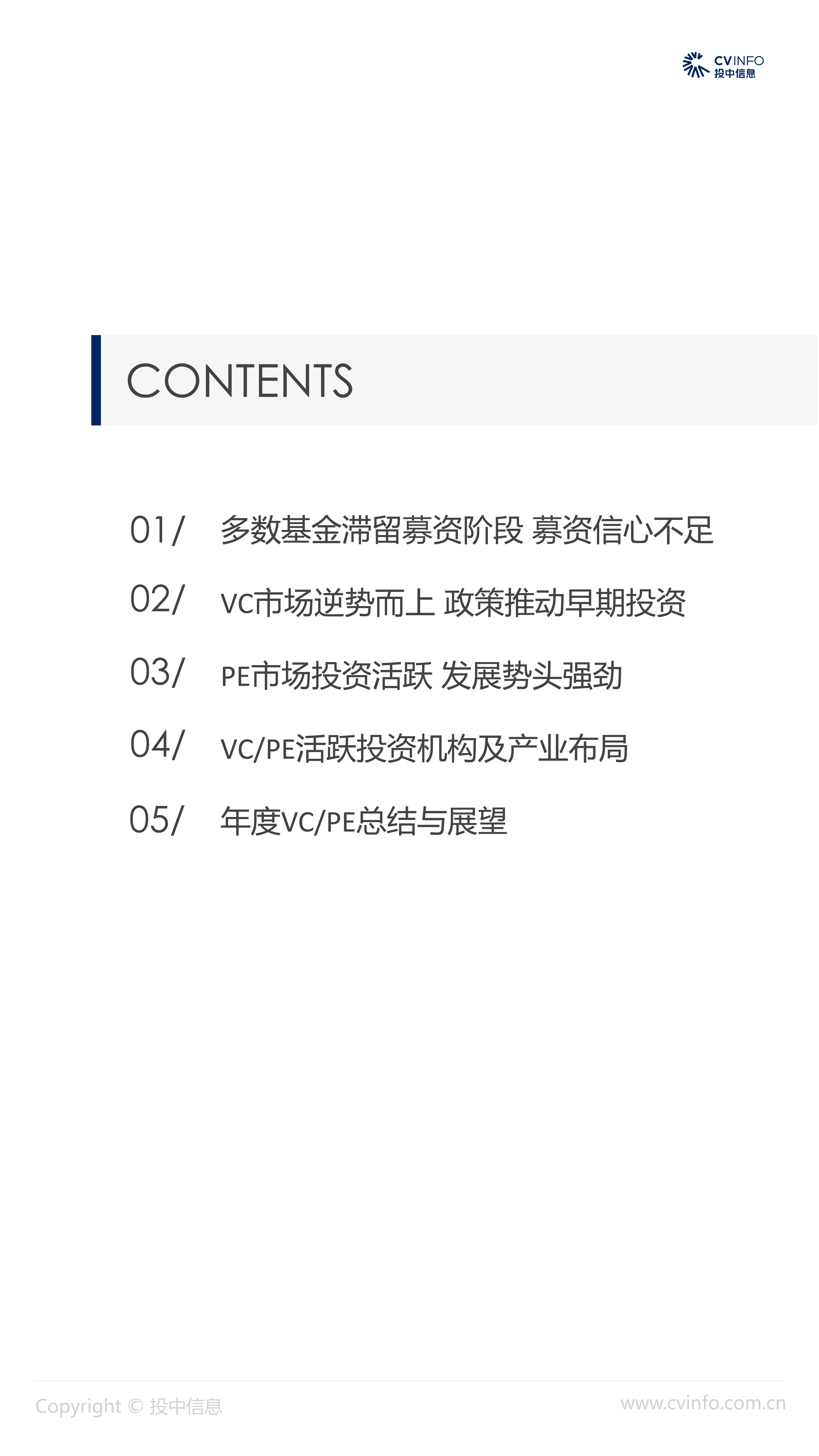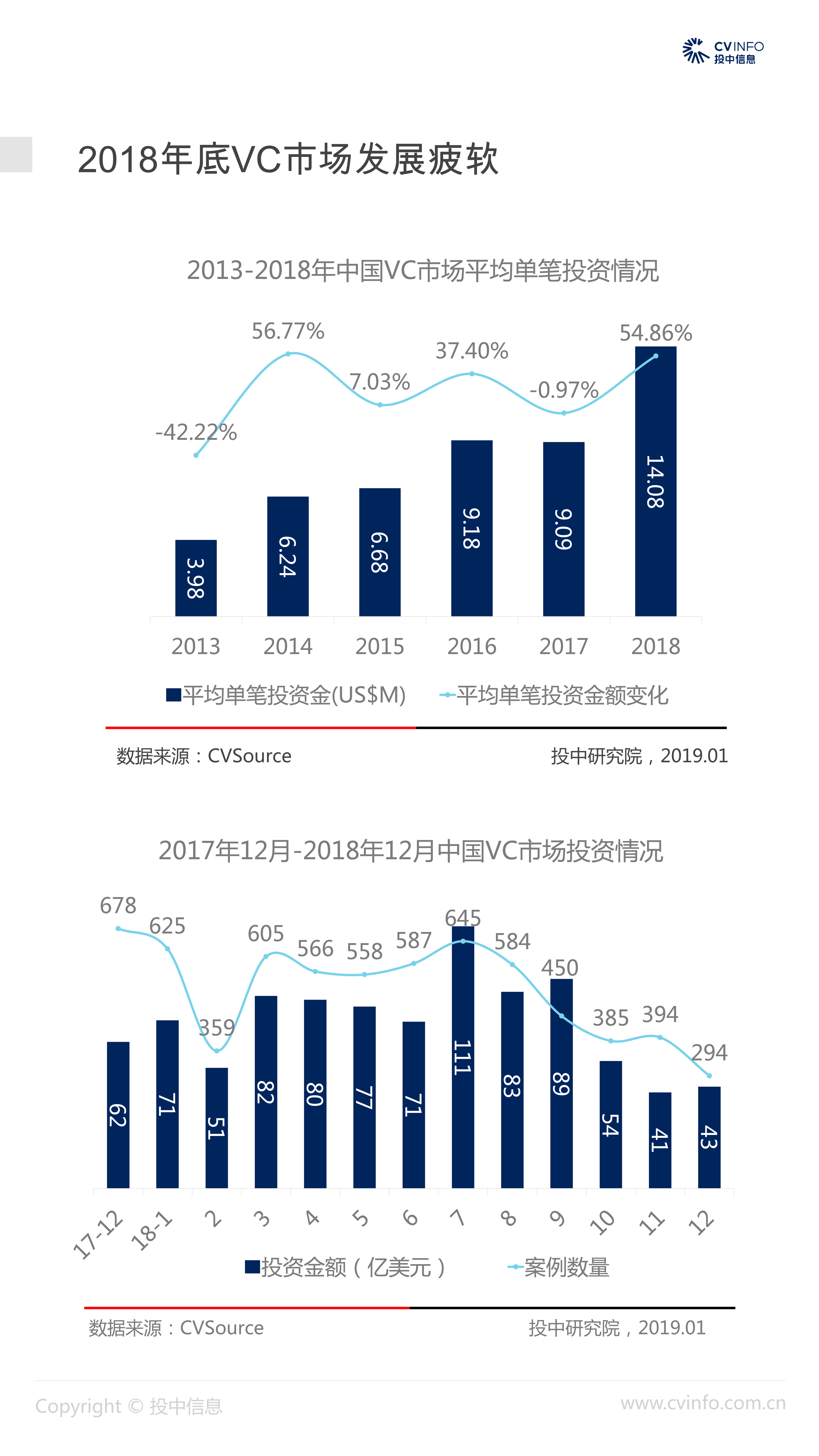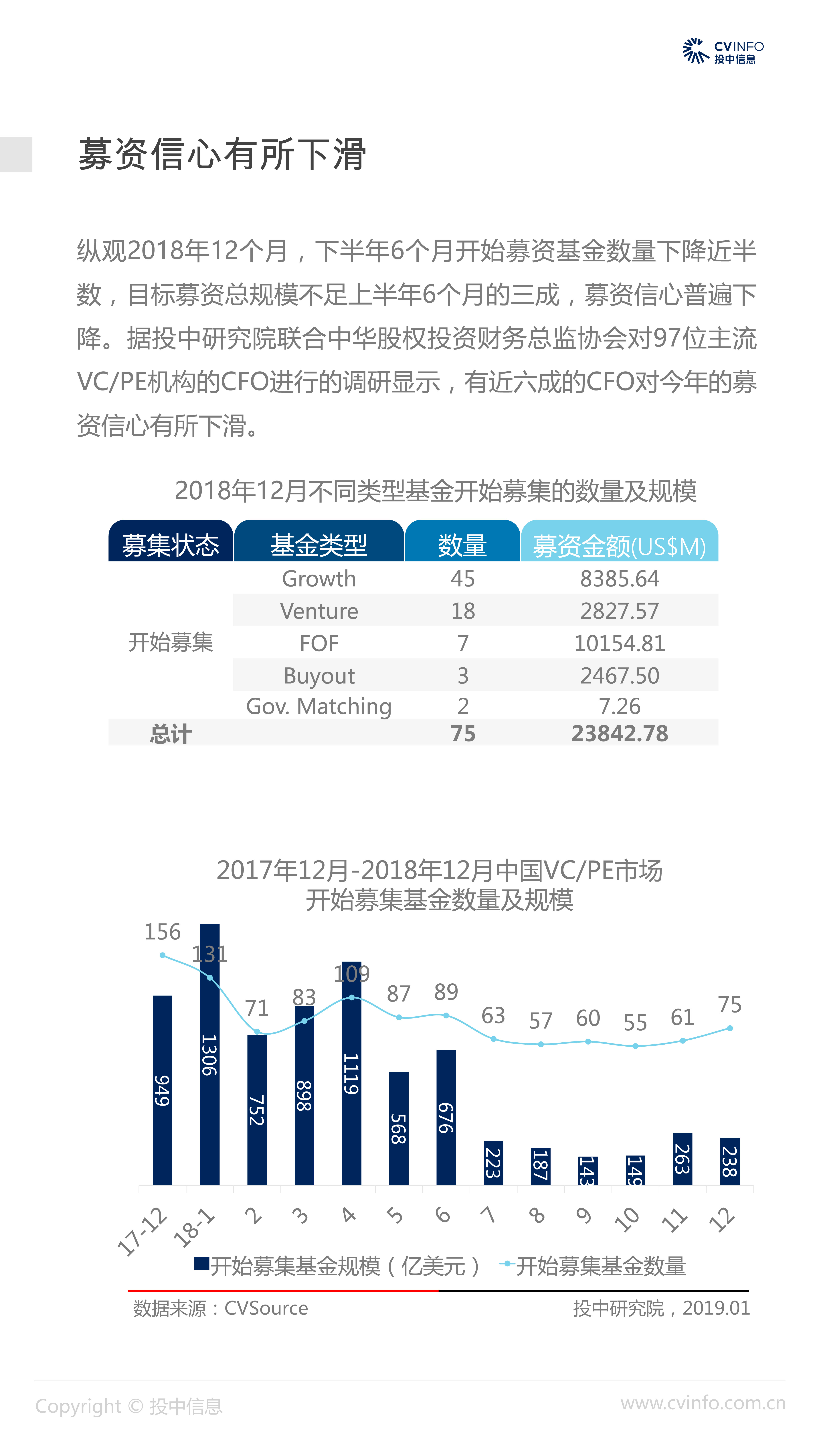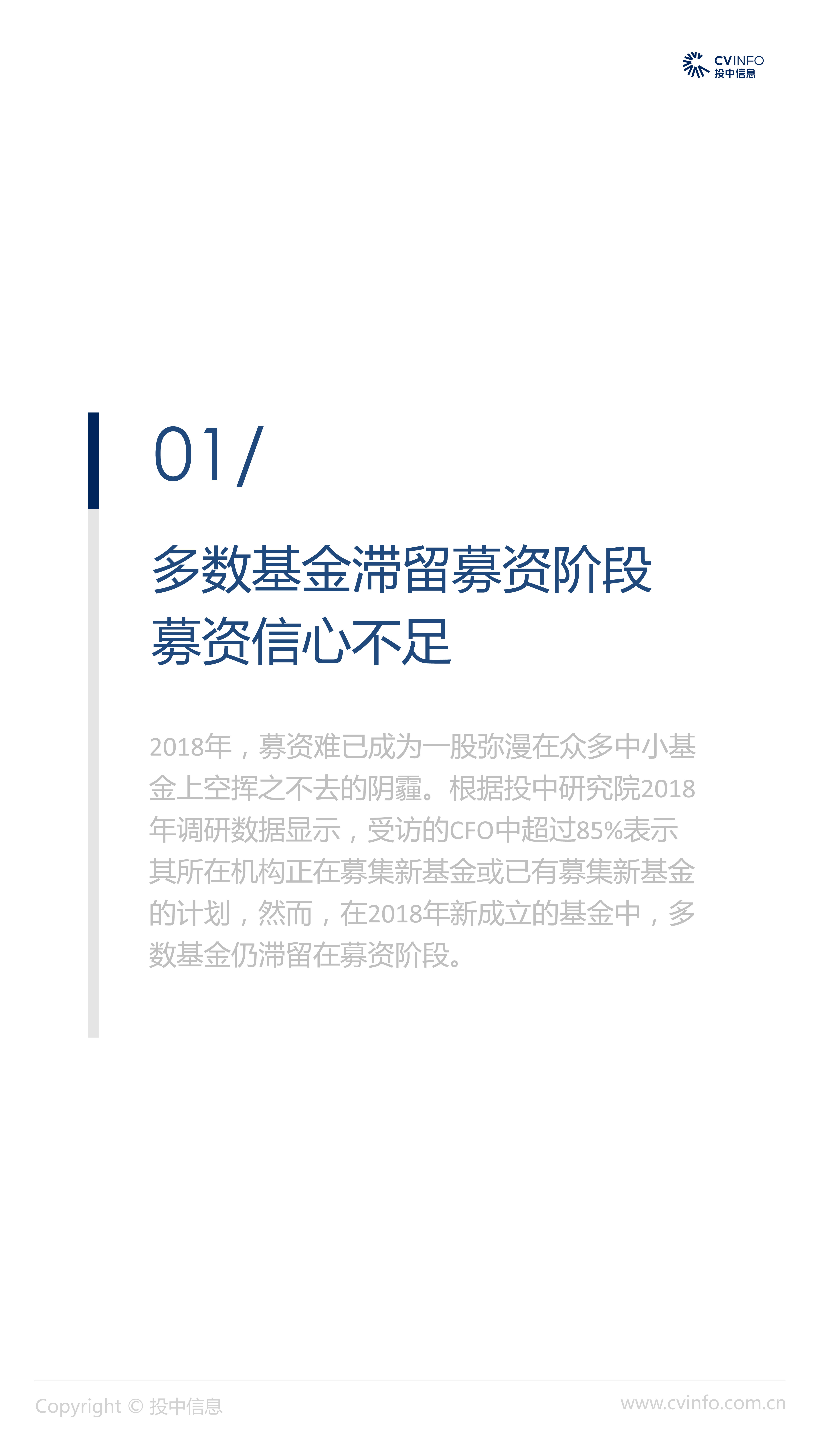 募资:2018年VC/PE市场全面进入洗牌期,新成立的基金多数仍滞留在募资阶段,募资周期变长。2018年VC/PE机构募集新基金的需求依旧强劲,然而在募资需求不断增长的同时,资金争夺战也在日益激烈,募资难问题全面爆发。 投资:2018年创投市场逆势而上,仍然保持着较高活力,整体投融资表现稳中有升。PE市场融资整体状况相对乐观,不论融资数量和规模都呈稳步攀升态势。 机构:2018年,VC/PE投资机构普遍面临严峻的挑战,市场格局已形成严重的两极分化,极少数的头部机构能够保持较高活跃度,而大量的中小机构和行业人员处于“募资难”“投资少”的低迷运营状态。