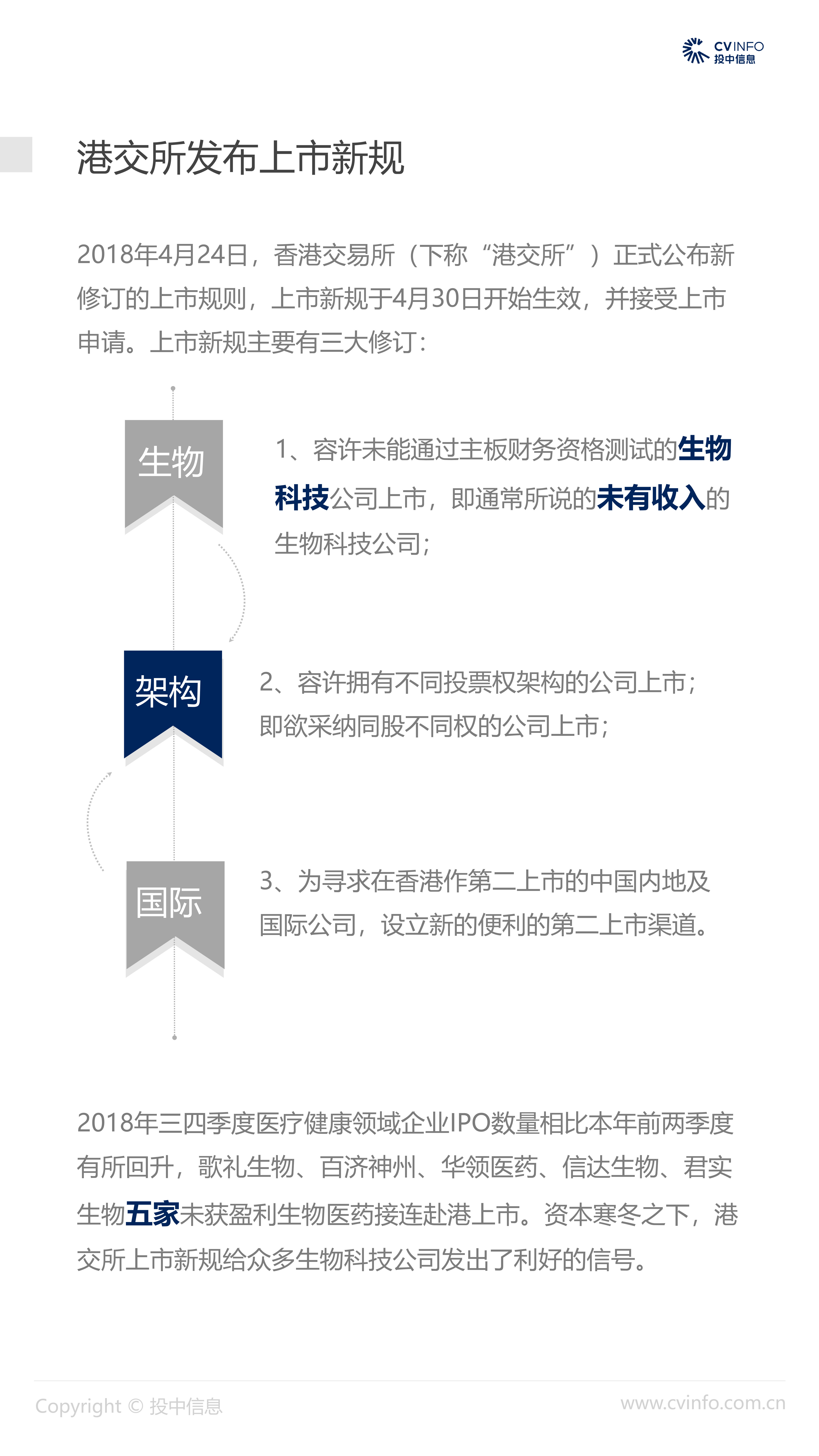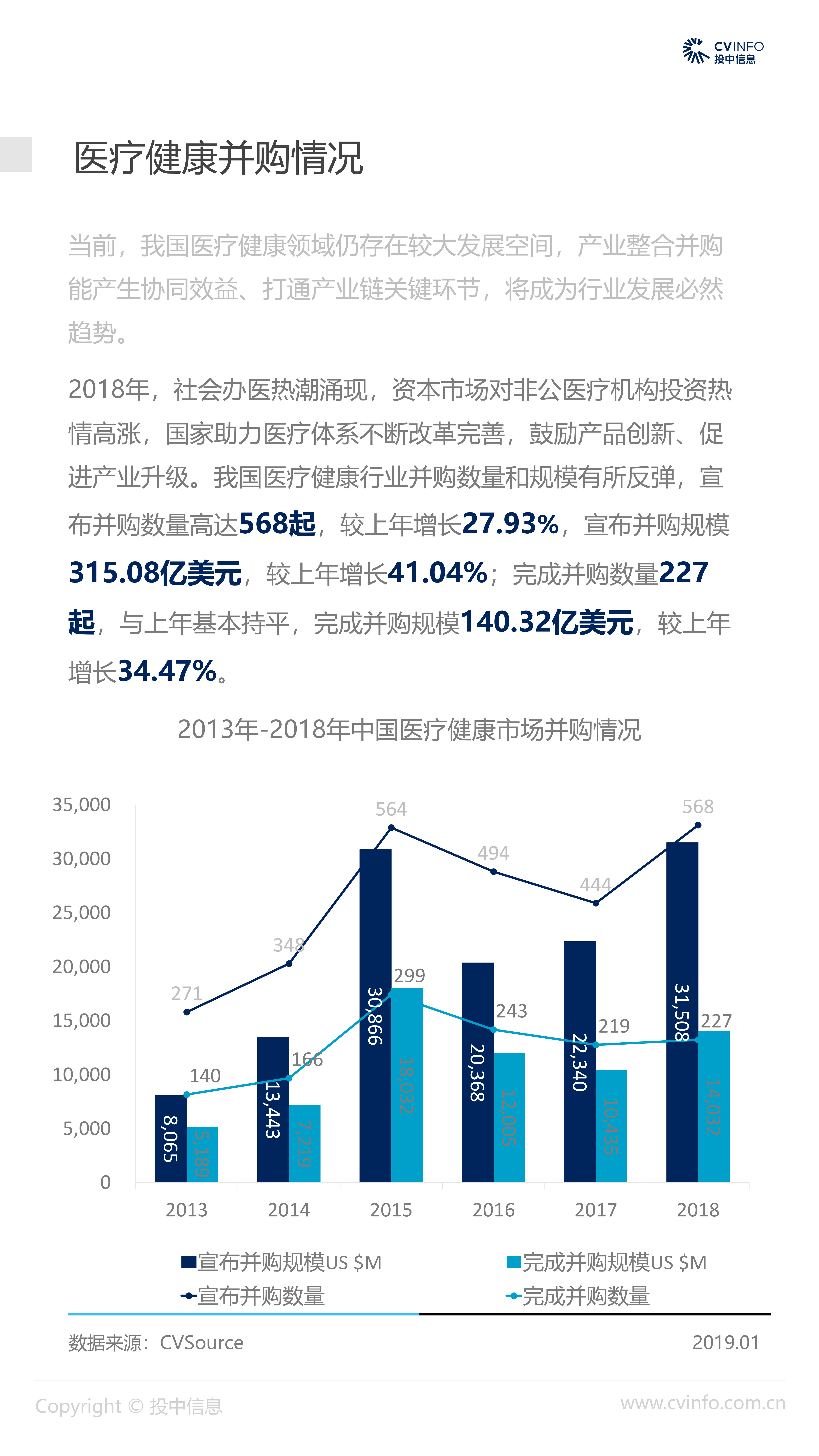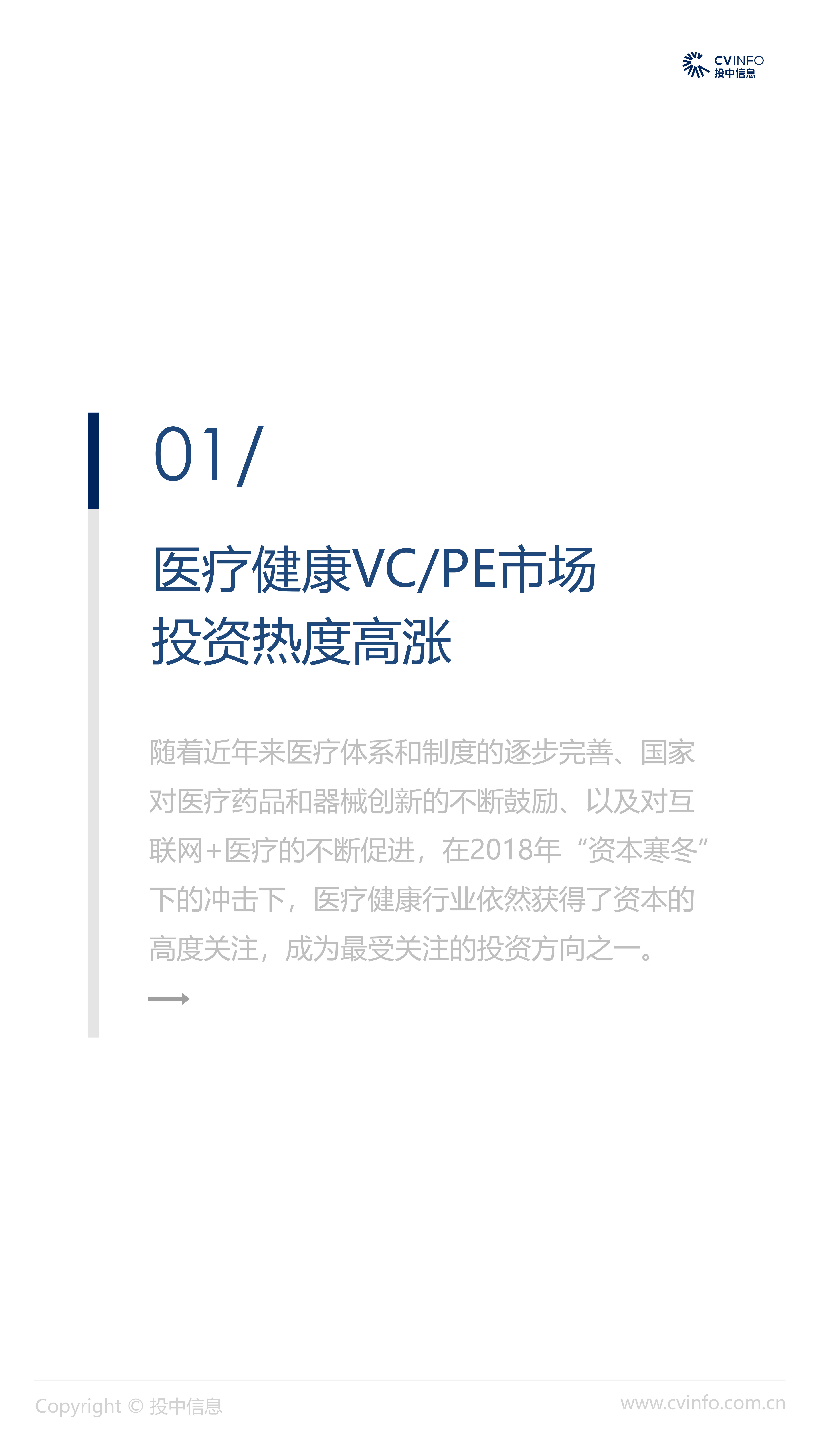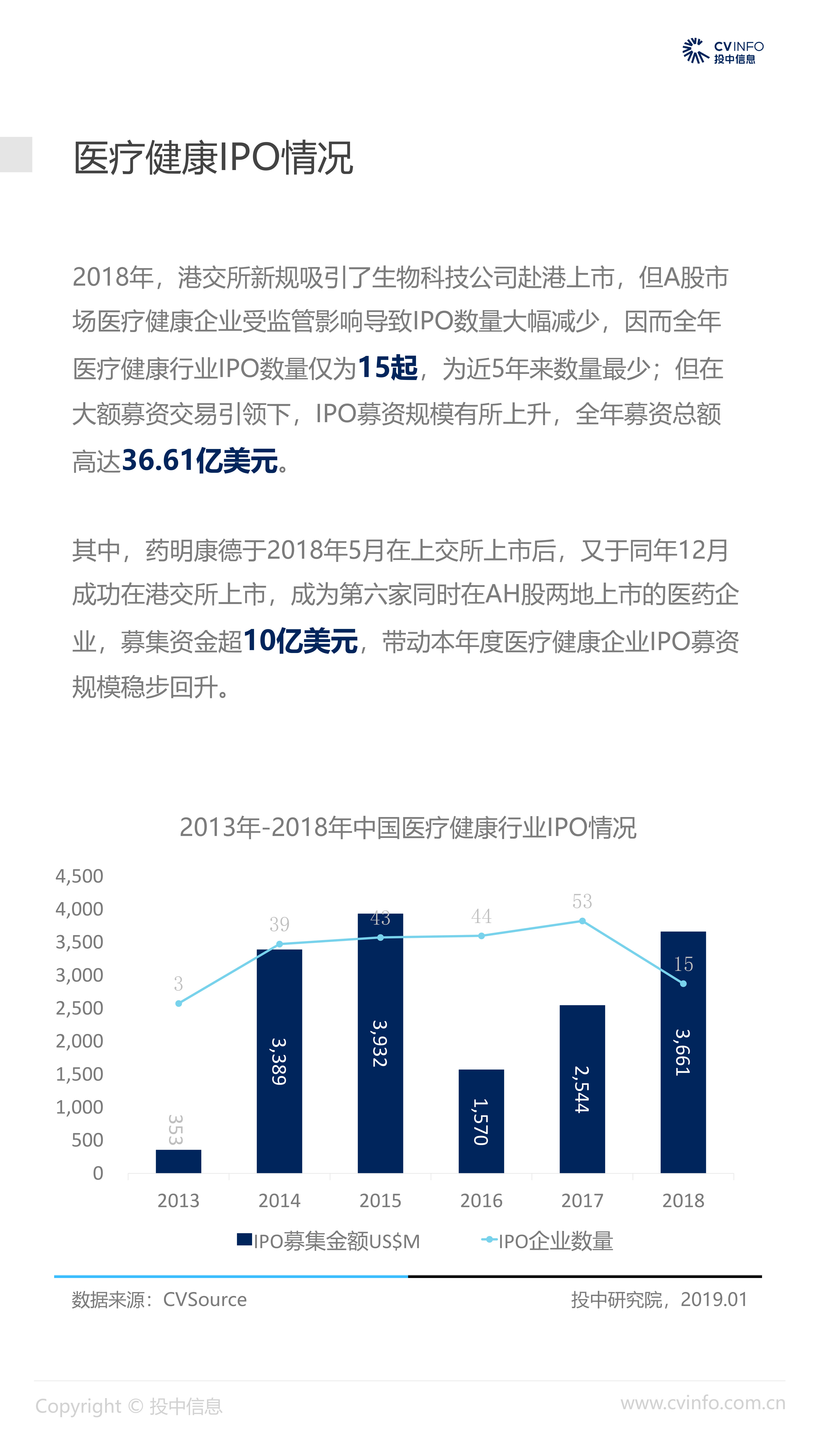 融资:随着近年来医疗体系和制度的逐步完善、国家对医疗药品和器械创新的不断鼓励、以及对互联网+医疗的不断促进,在2018年“资本寒冬”下的冲击下,医疗健康行业依然获得了资本的高度关注,成为最受关注的投资方向之一。 并购:2018年,社会办医热潮涌现,资本市场对非公医疗机构投资热情高涨,国家助力医疗体系不断改革完善,鼓励产品创新、促进产业升级;我国医疗健康行业仍存在较大发展空间,产业整合并购能产生协同效益、打通产业链关键环节,将成为行业发展必然趋势。 IPO:2018年,港交所新规吸引了生物科技公司赴港上市,降低了生物科技公司上市门槛;但A股市场监管趋严,医疗健康企业上市受到影响,导致IPO数量大幅减少。 政策:2018年,国家积极推进“互联网+医疗”发展,推动现代化医疗体系建设;不断完善国家基本药物制度,17中抗癌药纳入医保报销目录;港交所发布上市新规,修订生物科技公司上市规则。未来,医疗健康行业将受到更多关注。