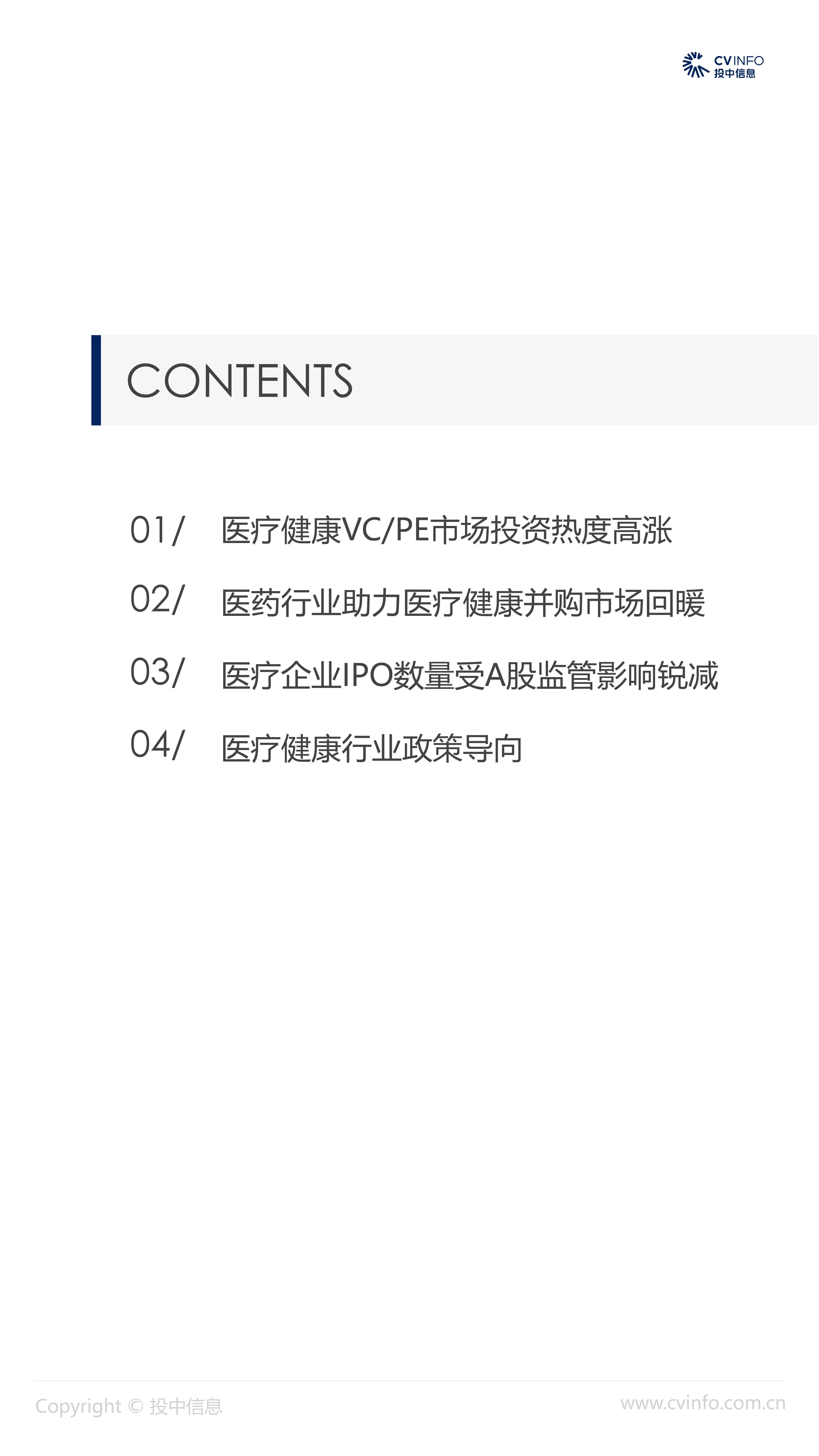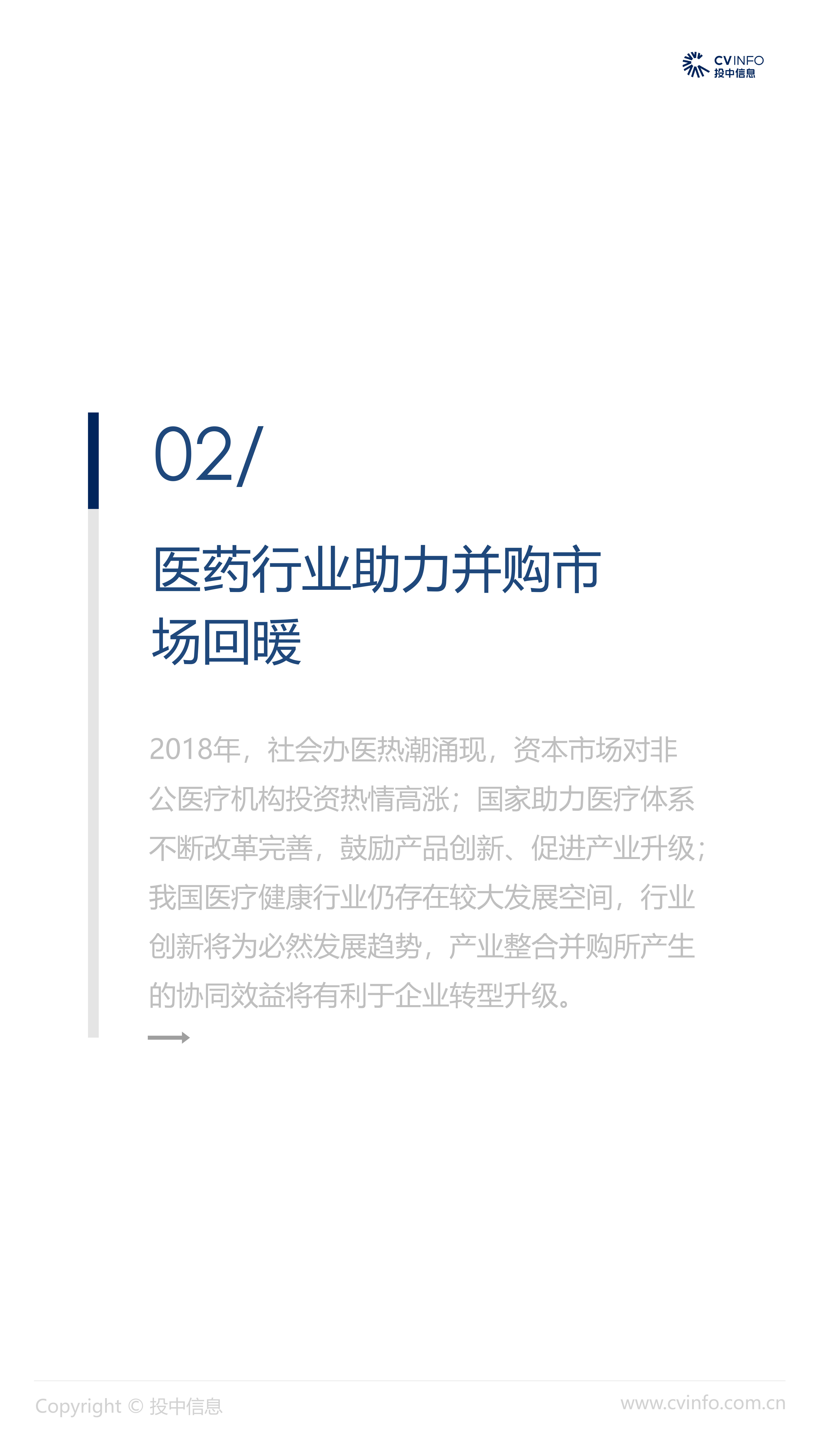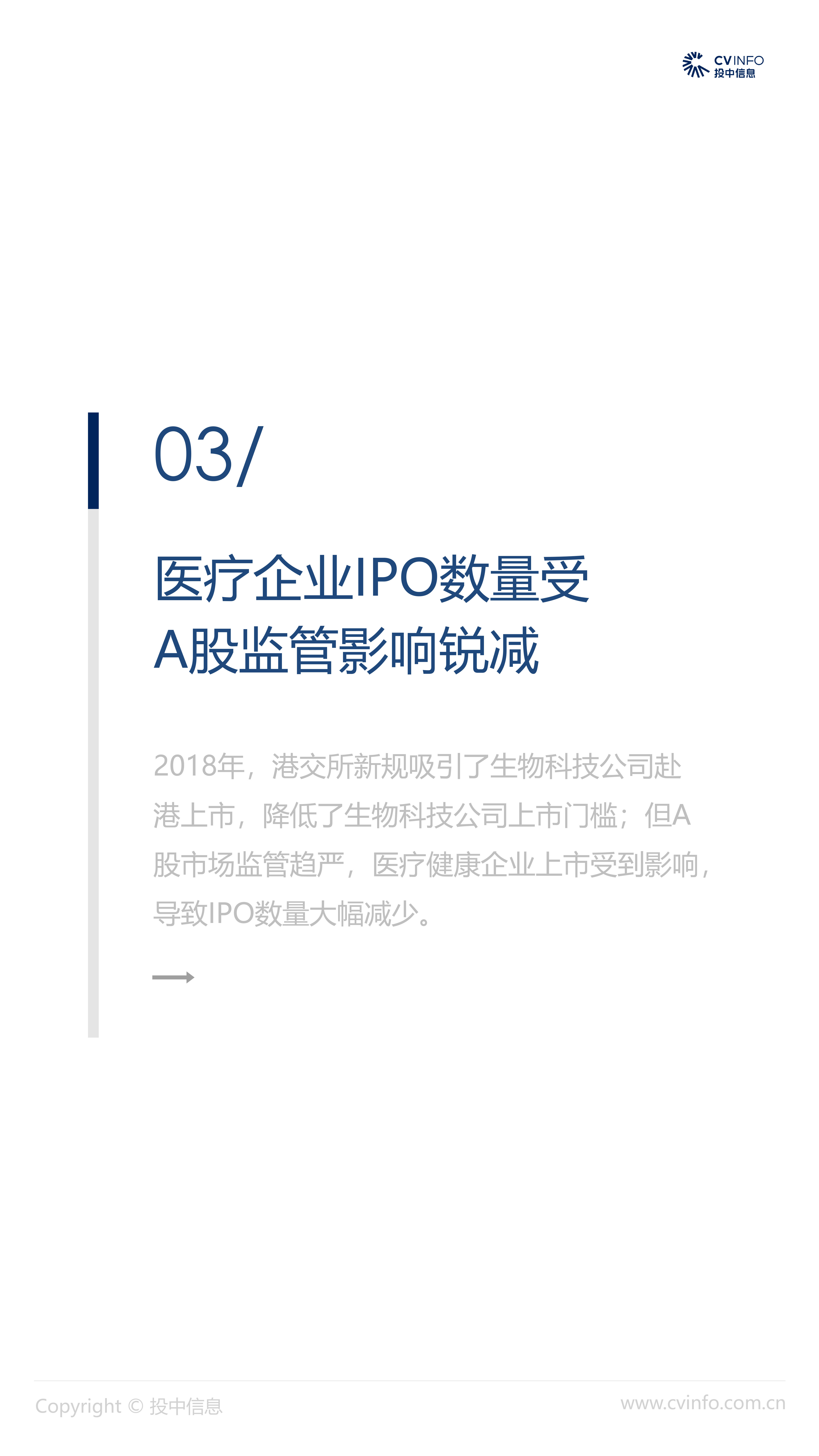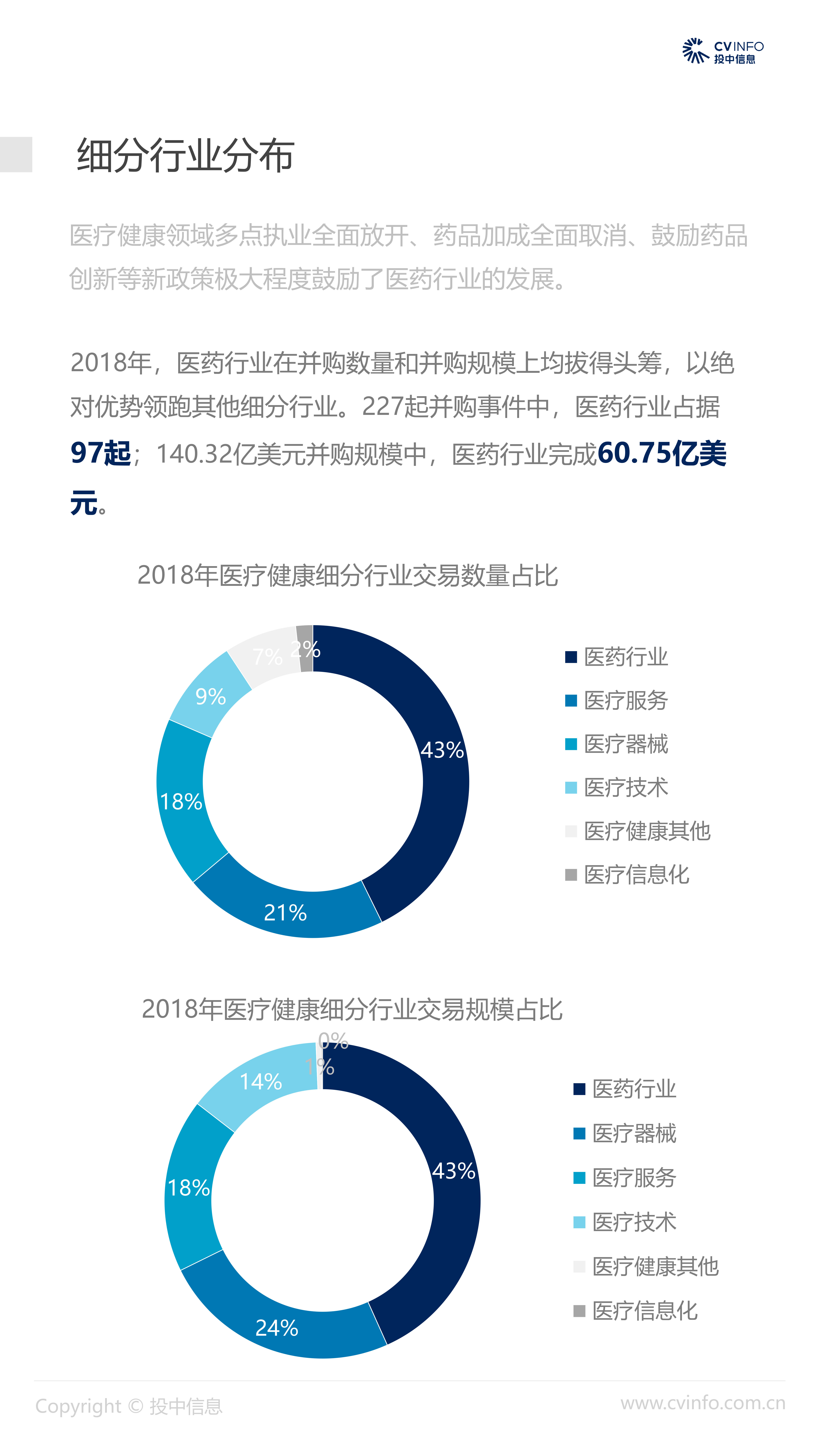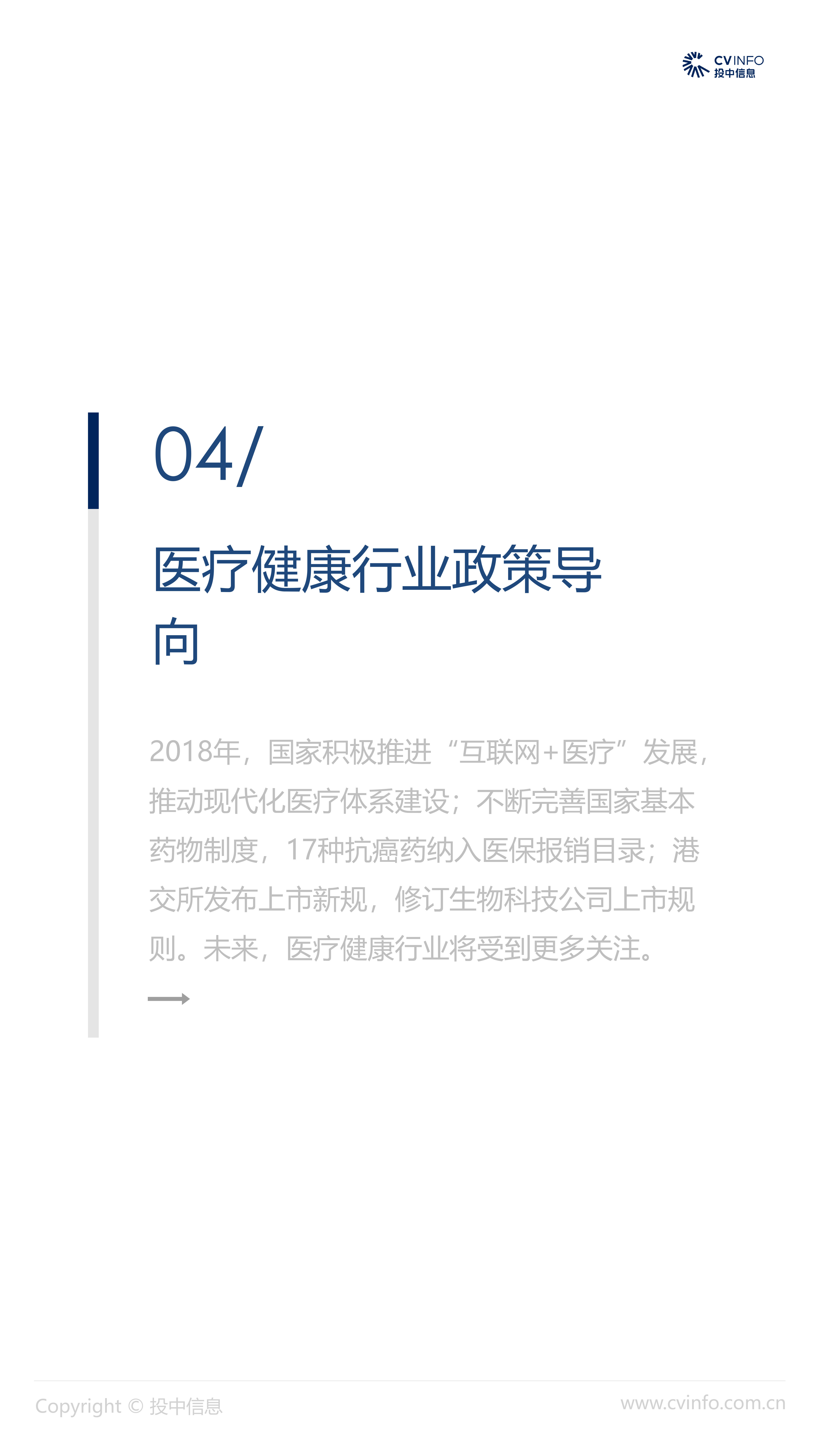 融资:随着近年来医疗体系和制度的逐步完善、国家对医疗药品和器械创新的不断鼓励、以及对互联网+医疗的不断促进,在2018年“资本寒冬”下的冲击下,医疗健康行业依然获得了资本的高度关注,成为最受关注的投资方向之一。 并购:2018年,社会办医热潮涌现,资本市场对非公医疗机构投资热情高涨,国家助力医疗体系不断改革完善,鼓励产品创新、促进产业升级;我国医疗健康行业仍存在较大发展空间,产业整合并购能产生协同效益、打通产业链关键环节,将成为行业发展必然趋势。 IPO:2018年,港交所新规吸引了生物科技公司赴港上市,降低了生物科技公司上市门槛;但A股市场监管趋严,医疗健康企业上市受到影响,导致IPO数量大幅减少。 政策:2018年,国家积极推进“互联网+医疗”发展,推动现代化医疗体系建设;不断完善国家基本药物制度,17中抗癌药纳入医保报销目录;港交所发布上市新规,修订生物科技公司上市规则。未来,医疗健康行业将受到更多关注。