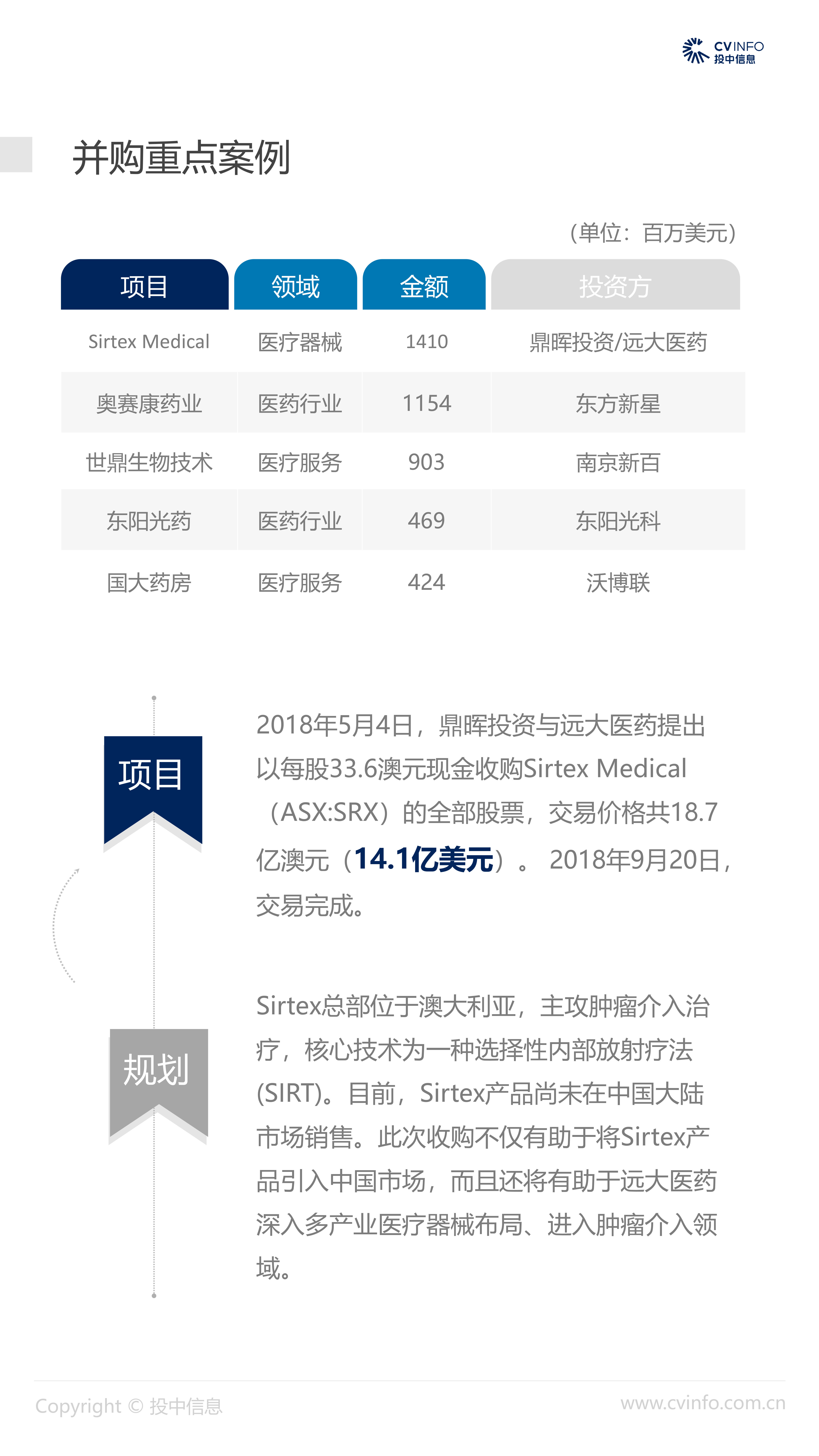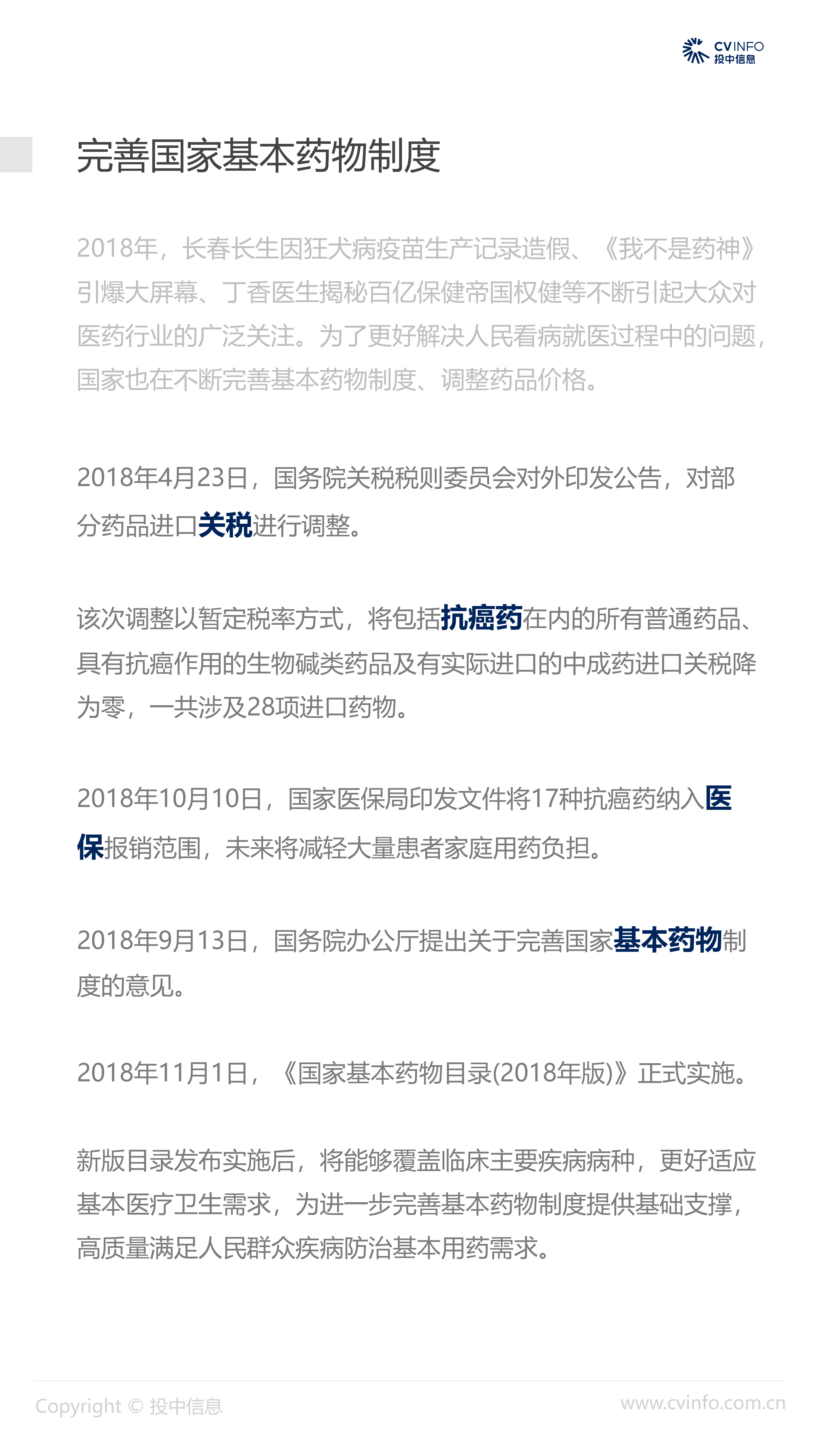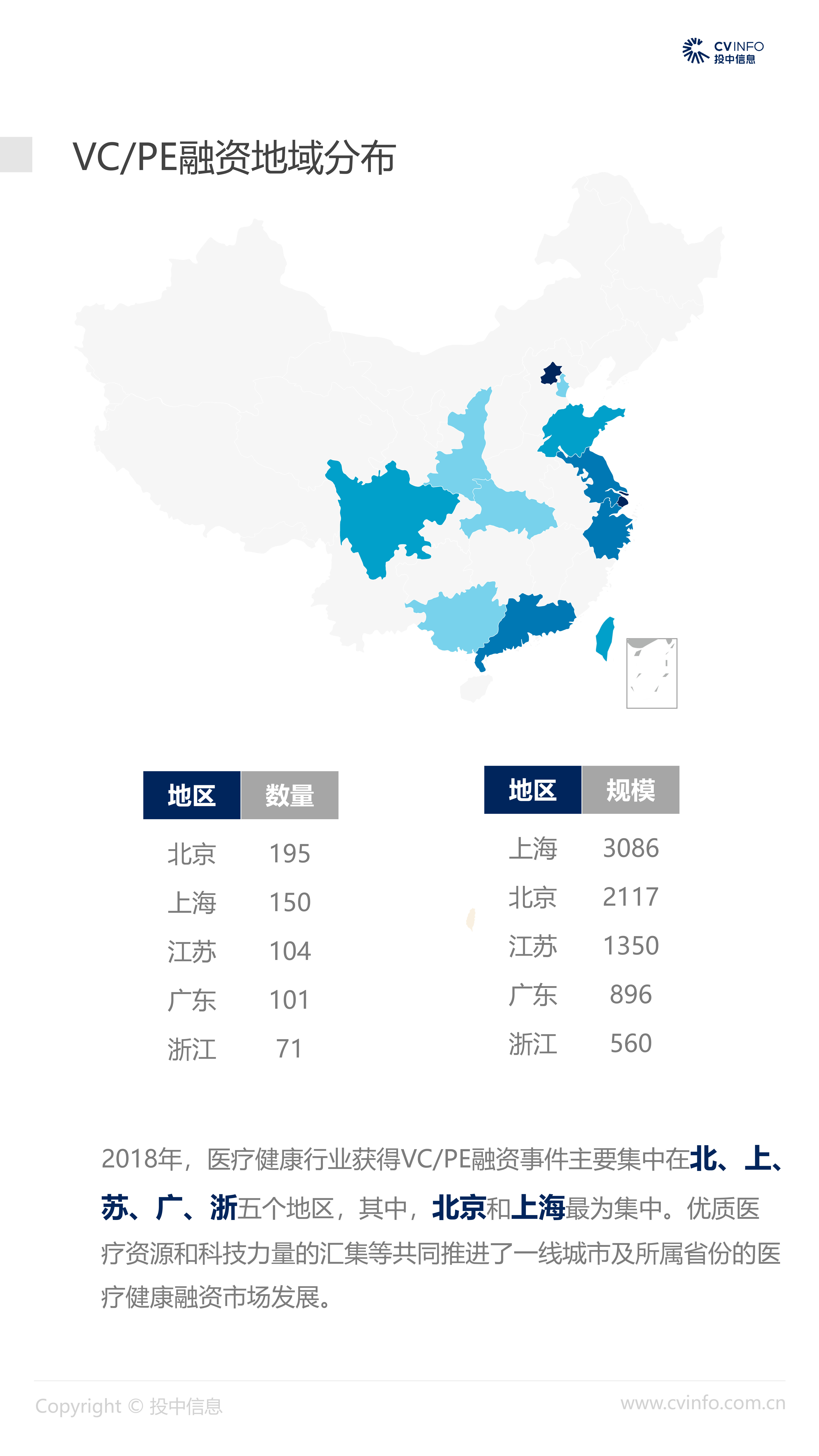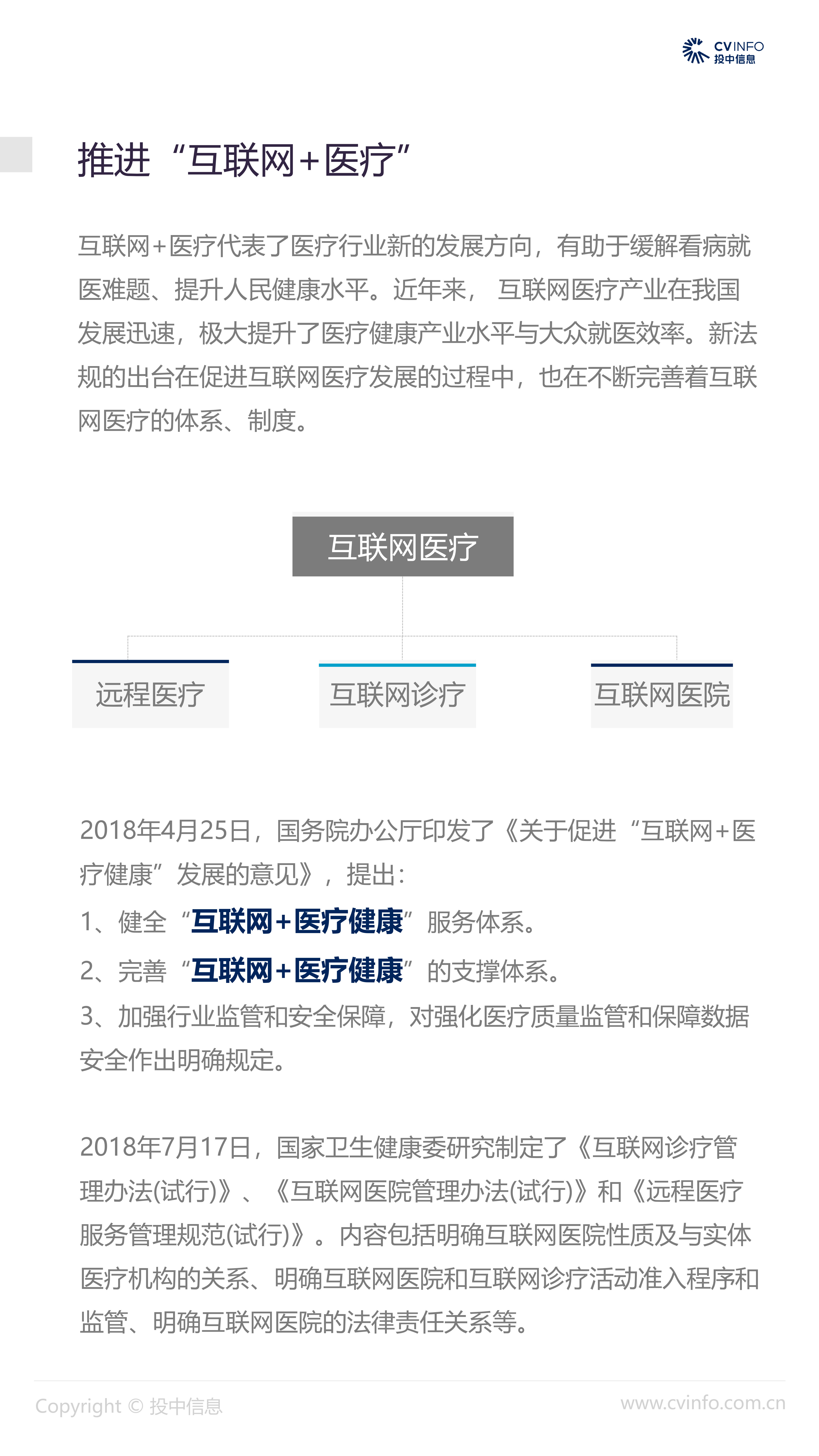 融资:随着近年来医疗体系和制度的逐步完善、国家对医疗药品和器械创新的不断鼓励、以及对互联网+医疗的不断促进,在2018年“资本寒冬”下的冲击下,医疗健康行业依然获得了资本的高度关注,成为最受关注的投资方向之一。 并购:2018年,社会办医热潮涌现,资本市场对非公医疗机构投资热情高涨,国家助力医疗体系不断改革完善,鼓励产品创新、促进产业升级;我国医疗健康行业仍存在较大发展空间,产业整合并购能产生协同效益、打通产业链关键环节,将成为行业发展必然趋势。 IPO:2018年,港交所新规吸引了生物科技公司赴港上市,降低了生物科技公司上市门槛;但A股市场监管趋严,医疗健康企业上市受到影响,导致IPO数量大幅减少。 政策:2018年,国家积极推进“互联网+医疗”发展,推动现代化医疗体系建设;不断完善国家基本药物制度,17中抗癌药纳入医保报销目录;港交所发布上市新规,修订生物科技公司上市规则。未来,医疗健康行业将受到更多关注。