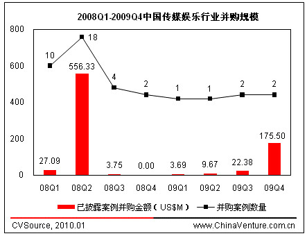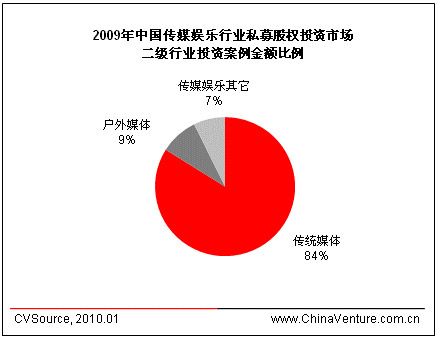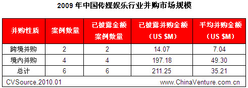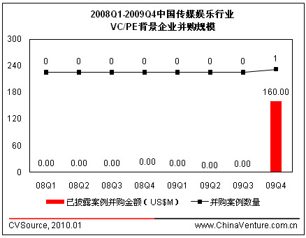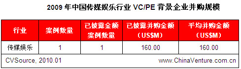 2009年传媒娱乐行业VC/PE背景中国企业并购案例1起,占并购案例总数的6.3%,列全部行业中的第6位;涉及并购金额1.6亿美元,占并购总金额的3.7%,列第4位,仅次于能源、连锁经营和电信及增值。唯一的VC/PE背景并购案例涉及的二级行业为户外媒体。