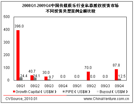 l 2009年,中国传媒娱乐行业创投及私募股权投资未能完全走出金融危机的阴影,仍然处于低位运行,投资案例数量和投资金额较2008年均有大幅下滑。虽然自第二季度起市场开始显露出复苏的迹象,但增长的趋势尚未确立。未来一年受IPO市场红火的影响,整体市场有望比2009年更为活跃,会否出现稳步增长仍有待观察。