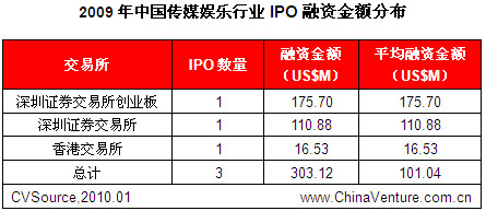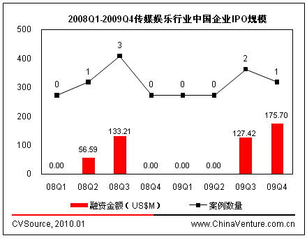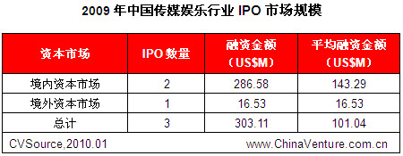 中国传媒娱乐行业IPO自2008年第三季度达到高点后,连续三个季度未监测到IPO案例发生,进入2009年第三季度以来,IPO市场才逐渐走出寒冬,开始稳步复苏,并于第四季度创下近两年融资金额的新高。全年共计3家企业实现IPO,总计融资金额3.03亿美元。其中, 2家企业在境内资本市场IPO,融资金额为2.87亿美元;另有1家企业在境外资本市场成功实现IPO,融资金额为1653万美元。