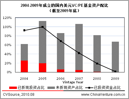 ChinaVenture 投中集团旗下数据产品CVSource 掌握的数据显示,截至2009年底,首轮投资时间为2004年、至今投资周期已过半的国内美元VC/PE基金,目前已有26%的资金退出折现并返还LP;首轮投资时间为2005年的基金,已折现资金比例为20%;首轮投资时间为2006-2007年的基金,已折现资金比例为5-6%。典型退出案例包括NEA 11期基金(2004年成立)退出展讯(SPRD.NASDAQ),赛富亚洲投资二期基金(2005年成立)退出完美时空(PWRD.NASDAQ)等。