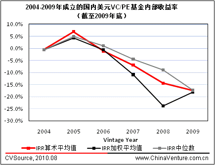 2004年之后,外资VC/PE机构开始大规模进入中国市场,美元基金成为国内企业进行私募融资的首选目标。今年8月,ChinaVenture 投中集团通过对投资于中国的美元VC/PE基金回报情况进行分析发现:截至2009年底,成立满5年的美元基金有80%以上的投资尚未折现,已有退出记录的基金回报率则集中于0-5%之间;较之Venture型基金,2008年之后成立的Growth型基金具有更大的盈利潜力。