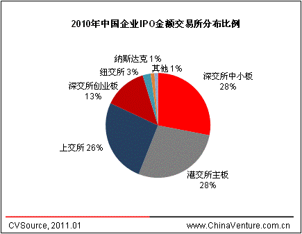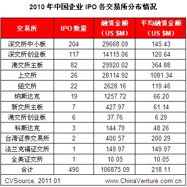 ChinaVenture 投中集团最新发布《2010年中国企业上市统计分析报告》,报告显示,2010年共有490家中国企业在全球资本市场实现IPO,总计融资规模1068.75 亿美元,无论是IPO数量还是融资金额均达到年度历史最高水平。由于2009年10月份创业板的出台,深交所2010年共有321家公司上市,占比达65.4%,香港、美国上市的中国企业数量也均达到历史最高峰。