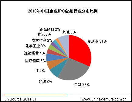 从IPO融资金额来看,融资最多的行业是制造业、金融及能源(见图6)。金融行业以27% 的比例占据2010年IPO"吸金"行业第二位,主要源于几起巨额IPO案例,包括农业银行A+H股上市、光大银行、华泰证券上交所IPO以及重庆农商行香港IPO等事件,仅此4起案例其融资总额就高达274.72亿美元。