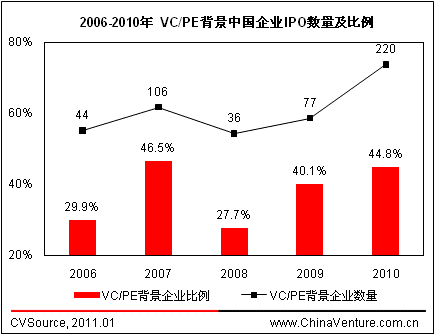 图6 2006-2010年VC/PE背景中国企业IPO数量及比例