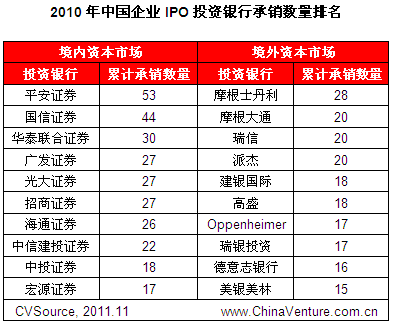 同样,2010年中国企业IPO的爆发式增长也让众多投资银行获得丰厚回报。根据ChinaVenture 投中集团旗下数据库产品CVSource 统计显示,2010年451起中国企业全球IPO事件中,共有168家投资银行参与保荐及承销。境内IPO方面,参与IPO承销(包括作为主承销商、副主承销商及分销商)数量最多的三家投行分别是平安证券、国信证券及华泰联合证券;境外方面,参与中国企业IPO数量最多的四家投资银行分别为摩根士丹利、摩根大通、瑞信及派杰(见表5)。
