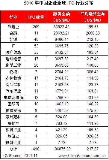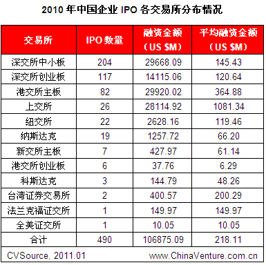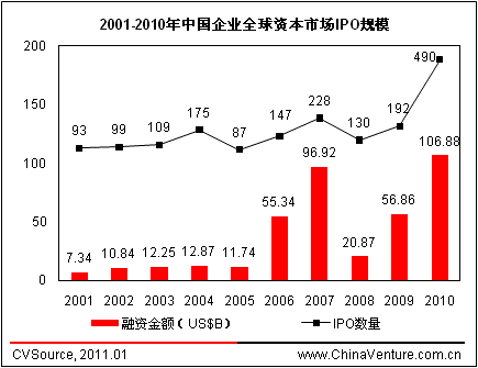 2010年共有490家中国企业实现IPO,相比2009年增长155.7%;融资金额共计1068.75亿美元,环比增长88.0%。2010年中国企业IPO数量及融资规模均超越了2007年228家企业上市、融资总额969.23亿美元的历史高位。