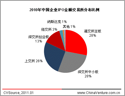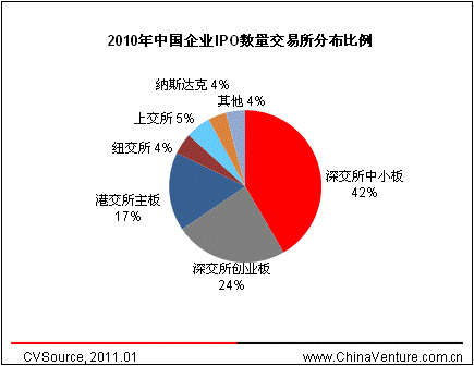 境内方面,2010年境内资本市场融资企业数量大幅增加,由2009年的99起,升至347起,涨幅达250.5%,相比2007年125起IPO最高纪录,增长比例也达到177.6%。其中,204家企业选择了深交所中小板上市,117家企业选择深交所创业板IPO,深交所上市企业在2010年中国企业全球IPO总量中占比达65.4%;上交所上市企业有26家。
