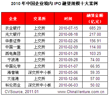 表2.1-1 2010年中国企业境内IPO融资规模十大案例