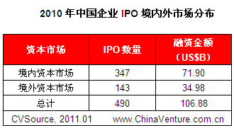 2010年共有490家中国企业实现IPO,相比2009年增长155.7%;融资金额共计1068.75亿美元,环比增长88.0%。2010年中国企业IPO数量及融资规模均超越了2007年228家企业上市、融资总额969.23亿美元的历史高位。 从市场分布来看,2010年共有347家中国企业在境内资本市场IPO,融资金额高达719.98亿美元,有143家中国企业在境外资本市场IPO,融资金额为349.78亿美元。