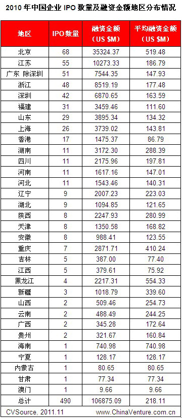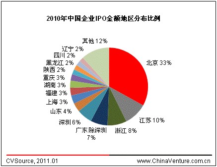 实现IPO中国企业最多的三个地区分别为北京、江苏和广东,2010年活跃于资本市场的企业仍以东部沿海地区企业为主。