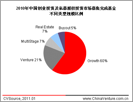从目前完成(含首轮完成)基金的类型来看,2010年创投(Venture)基金数量为123支,占据总量的半数以上,其次为成长型(Growth)基金,数量占比为38%;募资规模方面,成长型基金完成募资178.00亿美元,占比达60%;创投基金募资61.57亿美元,占比为21%。相比2009年成长型基金募资数量及完成规模占比分别为19%和33%的情况,2010年成长型基金募资数量及规模占比均出现较大幅度增长,而创投基金数量及募资规模占比则相对下降。这一趋势也验证了目前中国股权投资市场上市前(Pre-IPO)投资受到热捧、早期投资遭受冷遇的现状。