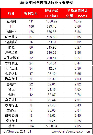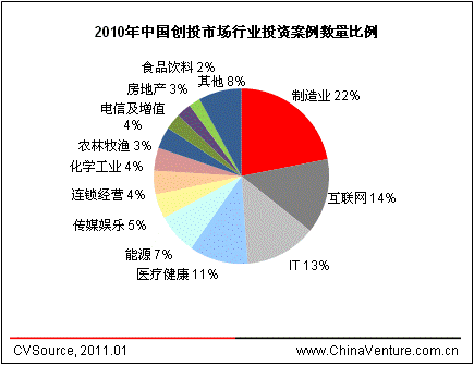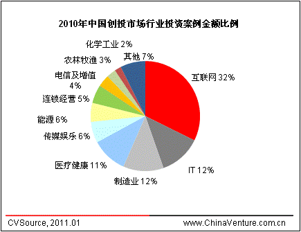 创业投资方面,2010年全年披露VC投资案例804起,投资总额56.68亿美元,相比2009年分别上升65.1%和93.3%,无论披露投资案例数量还是投资金额,均超过2007年721起案例、投资总额53.33亿美元的历史高位。2010年中国创投市场投资共涉及20个行业,制造业、互联网、IT及医疗健康行业分别披露案例176起、111起、106起和87起,皆占据10%以上投资案例数量比例;互联网行业融资总额最高,达18.31亿美元,占年度创投总额的32%。