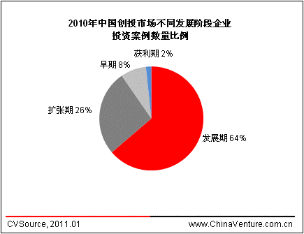 2010年中国创投市场仍以发展期投资案例数量居多,达到512起,占比达63.7%,相比2009年所占比例提高7个百分点;早期阶段企业融资案例64起,占比8.0%,相比2009年增长一倍。扩张期企业214家,占比26.7%,获利期企业13家,占比1.6%,均比2009年有所减少。