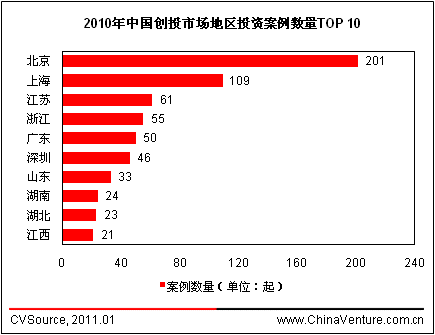 2010年,湖北、湖南、江西、四川、重庆等中西部地区省份也来越受到创投机构的关注,其中,湖北、湖南、江西无论在投资案例数量还是金额方面,均进入前十。一方面,东部沿海地区股权投资市场激烈的竞争态势,迫使投资机构深入内陆地区寻找更好的投资机会;另一方面,中西部地区地方政府通过出台优惠政策、成立引导基金等方式吸引更多投资机构进行投资。可以预见,随着中国股权投资市场的成熟及政策的完善,东、西部地区创业投资市场的差距将逐渐缩小。