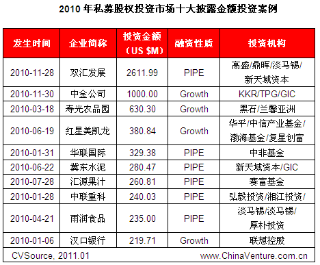 2010年中国PE投资市场披露融资金额最大的企业是双汇发展(000895.SZ),2010年11月28日,双汇发展向双汇集团和合资企业罗特克斯(Rotary Vortex Limited)定向发行A股股份6.32亿股,整体注入资产321.94亿元。其中,高盛、淡马锡、鼎晖、新天域共同出资178.32亿元。其次为中金公司的股权转让交易,2010年10月30日,摩根士丹利将所持34.3%股份分别出售给四家投资方--TPG、KKR、GIC及大东方控股,预计交易规模在10亿美元左右。排名第三的是2910年3月黑石集团牵头的财团投资中国农产品市场运营商寿光农产品物流园,交易金额在6亿美元左右(见表11-1)。