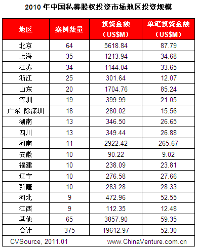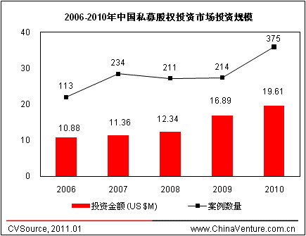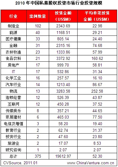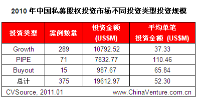 2010年全年披露PE投资案例375起,投资总额196.13亿美元,无论是披露投资案例数量还是投资金额,均达到历史最高,平均单笔投资金额为5230万美元。