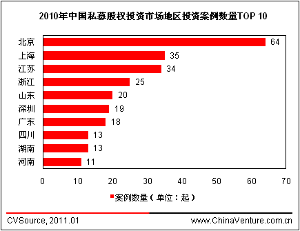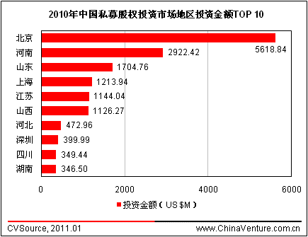 以2010年获得PE投资企业的地区分布来看,东部沿海地区仍是创投机构最为关注的地区。投资案例数量方面,北京、上海和江苏分别有64家、35家和34家企业获得PE投资,占据案例数量前三甲;投资金额最多的三个地区分别是北京、河南及山东,投资总额分别为58.19亿美元、29.22亿美元和17.04亿美元。相比之下,中西部地区省份因其传统行业的优势,在吸引PE投资规模方面排名更高,前10名中有4个为中西部省份。而河南则主要凭借其境内双汇发展的投资交易占据投资金额第二名。