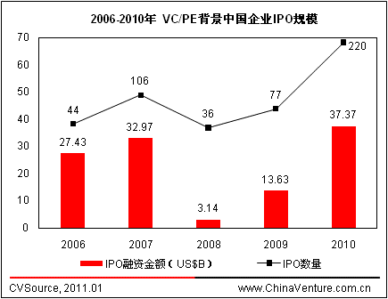 投资退出方面,2010年VC/PE背景中国企业境内外IPO数量为220家,融资金额373.74亿美元,占年度IPO总量的44.8%和35.0%,超过2007年106家VC/PE背景中国企业IPO、融资329.71亿美元的历史高位。