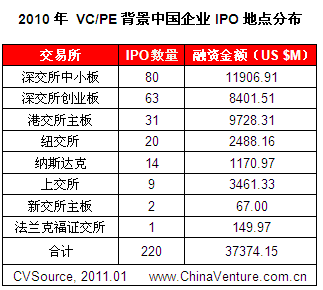 2010年VC/PE背景中国企业境内外IPO数量为220家,融资金额373.74亿美元,占年度IPO总量的44.8%和35.0%。其中,152家选择了境内上市,占比69.1%,A股市场依然是投资机构退出的主要渠道。
