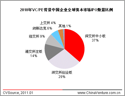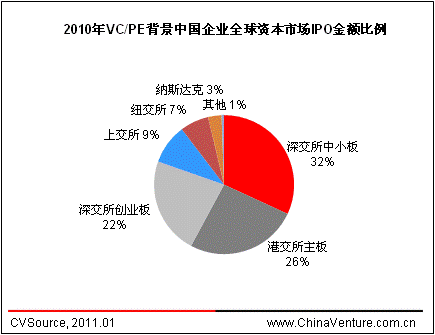 在2010年IPO的VC/PE背景中国企业中,152家选择了境内上市,占比69.1%,其中,创业板市场为VC/PE背景企业IPO提供了重要渠道,2010年登陆创业板的VC/PE背景企业达63家。