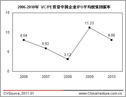 2010年投资机构通过企业IPO实现480笔退出,平均账面投资回报率为8.06倍,相比2009年下降28.2%。