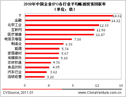 图17.3-3 2010年各行业企业IPO退出平均投资回报率