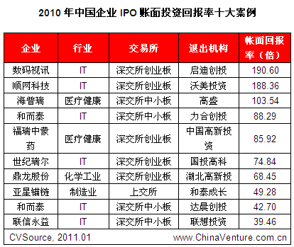 从具体案例来看,IT行业中,数码视讯IPO后启迪创投的账面回报率达190.60倍、顺网科技上市后沃美投资得以退出,账面回报率为188.36倍,这两笔退出拉高了整个IT行业的回报率水平--这两起IPO均出自深交所创业板。而在2010年回报率最高的十起退出案例中,IT行业有6起。2010年金融行业退出案例仅有3笔,但红杉中国在诺亚财富IPO中的账面投资回报率达35.31倍,拉高了该行业平均投资回报水平。