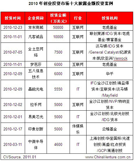 2010年中国创投市场披露融资金额最大的企业是京东商城,2010年12月23日该公司董事局主席刘强东称公司已经完成C轮融资,到账总额超过5亿美元。其次为凡客诚品,其在2010年11月完成1亿美元的第五轮融资,由联创策源领投,IDG资本、赛富、Tiger等追加投资。第三名是土豆网,同样于2010年完成第五轮融资,金额达7500美元,投资方包括淡马锡、General Catalyst、IDG资本、纪源资本及Venrock Associates等(见表5-1)。
