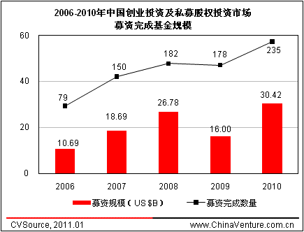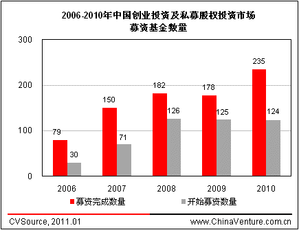 2010年中国VC/PE投资市场共披露基金359支,其中募资完成(含首轮募资完成)及开始募资基金数量分别为235支和124支;募资规模方面,募资完成(含首轮募资完成)及开始募资基金规模分别为304.18亿美元及407.56亿美元。