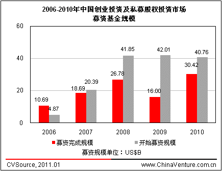 图2.1-2 2006-2010年中国创业投资及私募股权投资市场募资基金规模