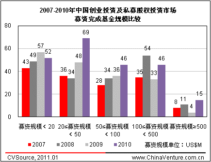 2010年新成立基金数量及目标规模相比2009年基本持平;而资金募资完成情况相比2009年则明显好转,并超过2008年182支基金募资267.78亿美元的历史高位,募资完成(含首轮完成)基金数量比2009年增加26.8%,而募资规模环比增加79.1%。