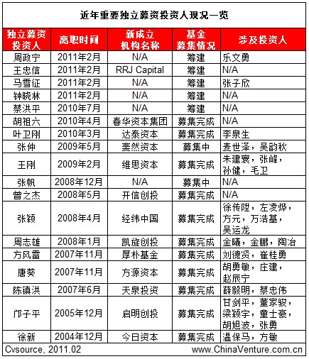 作为具备出色投资业绩的高层投资人,独立募集基金无疑将为其带来更大的自主决策权、更大的投资空间、更丰厚的管理费收入与业绩分红,而部分LP也会给予此类投资人一定关注。ChinaVenture投中集团旗下数据库产品CVSoruce掌握的数据显示,2005年以来,先后有超过18名高层投资人脱离之前所属的投资基金或投资银行,选择独立组建新团队、募集新的VC/PE基金,超过30名中高层投资人离职后加盟其新基金。